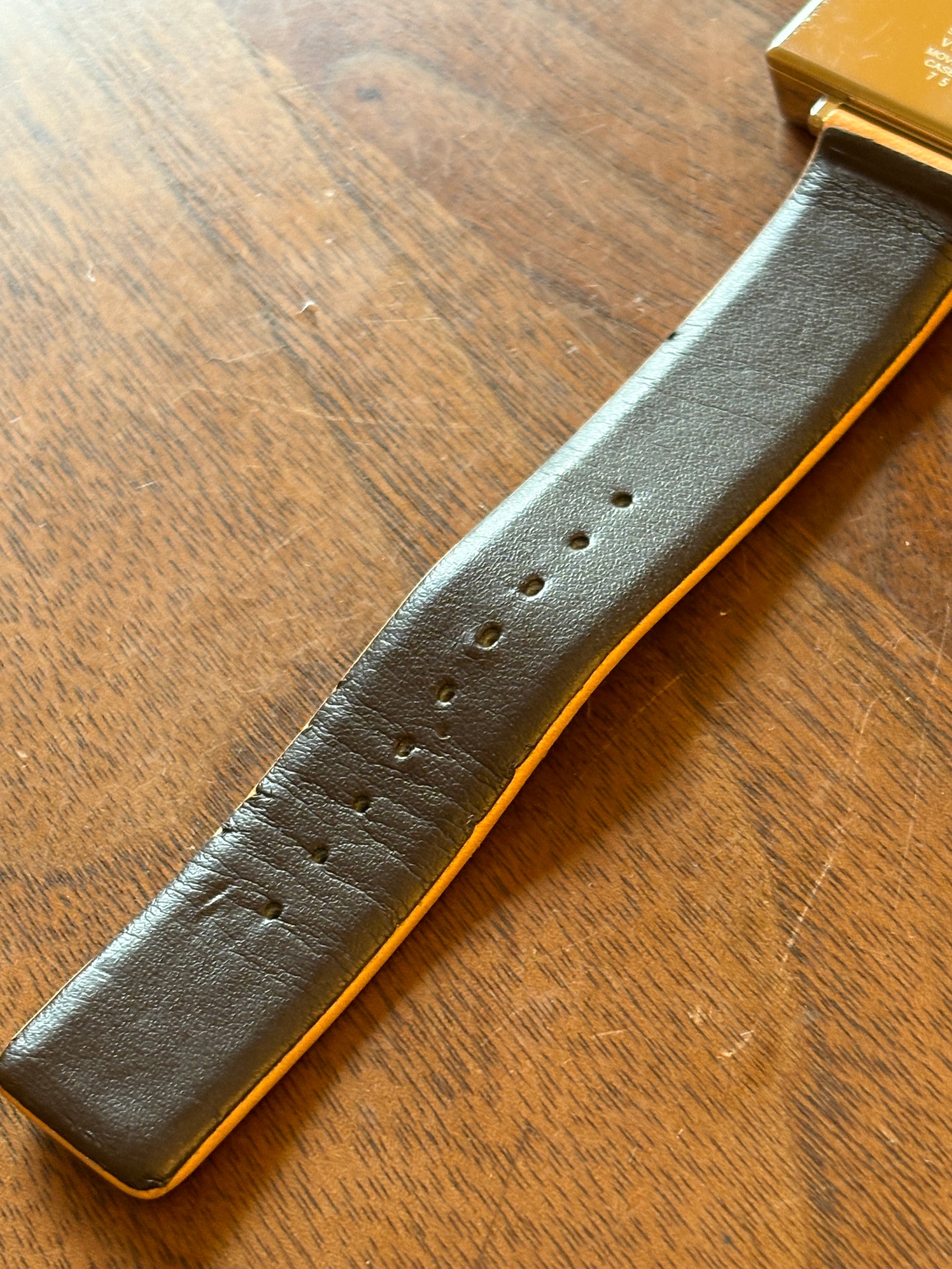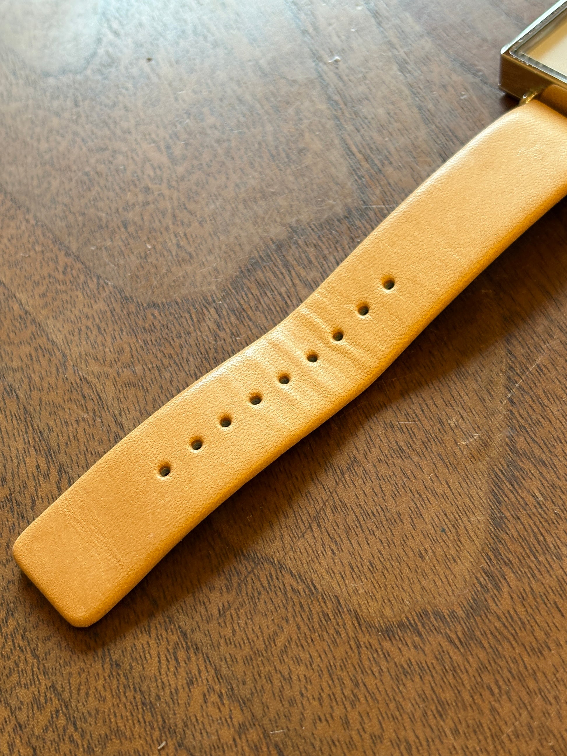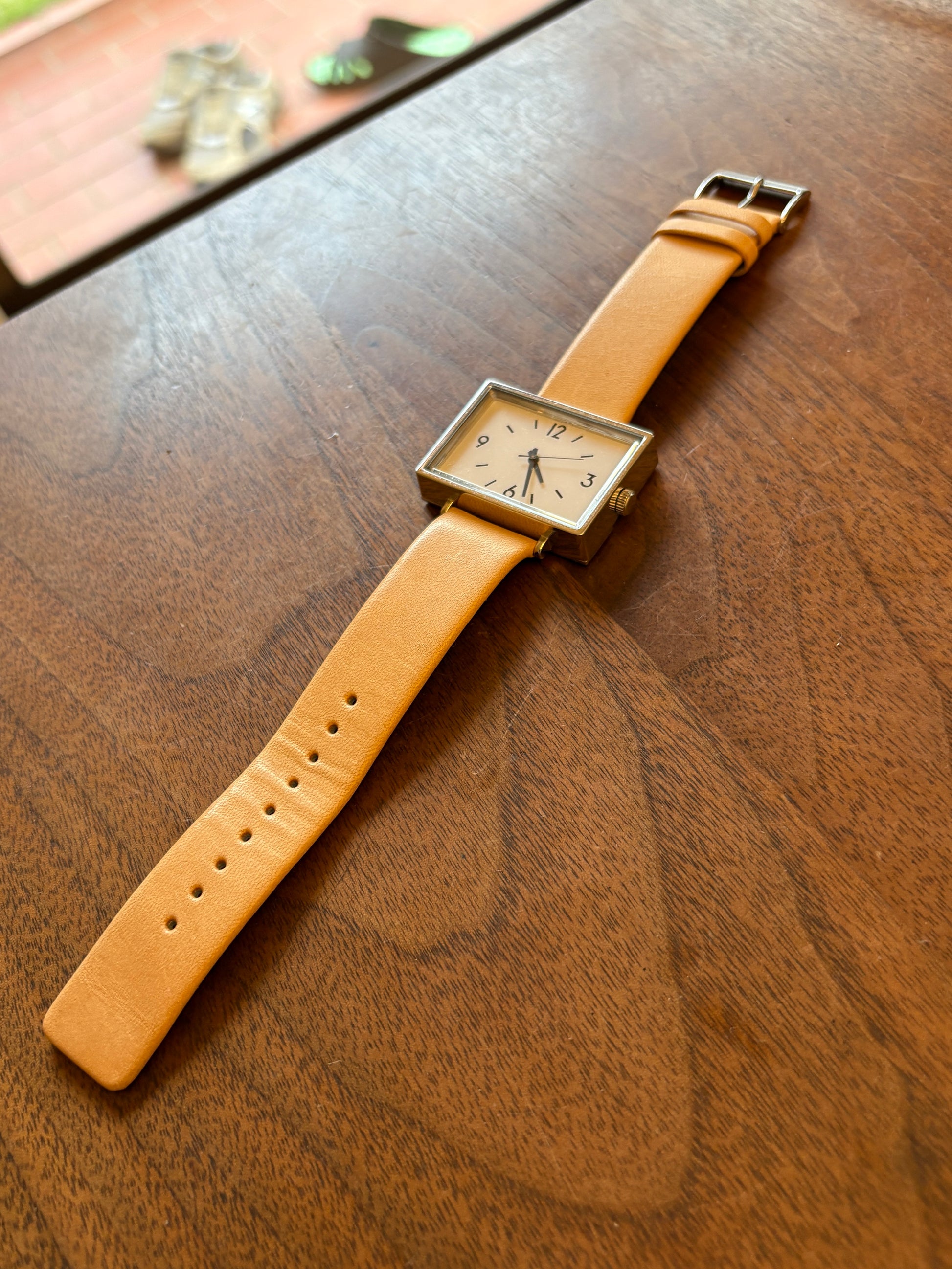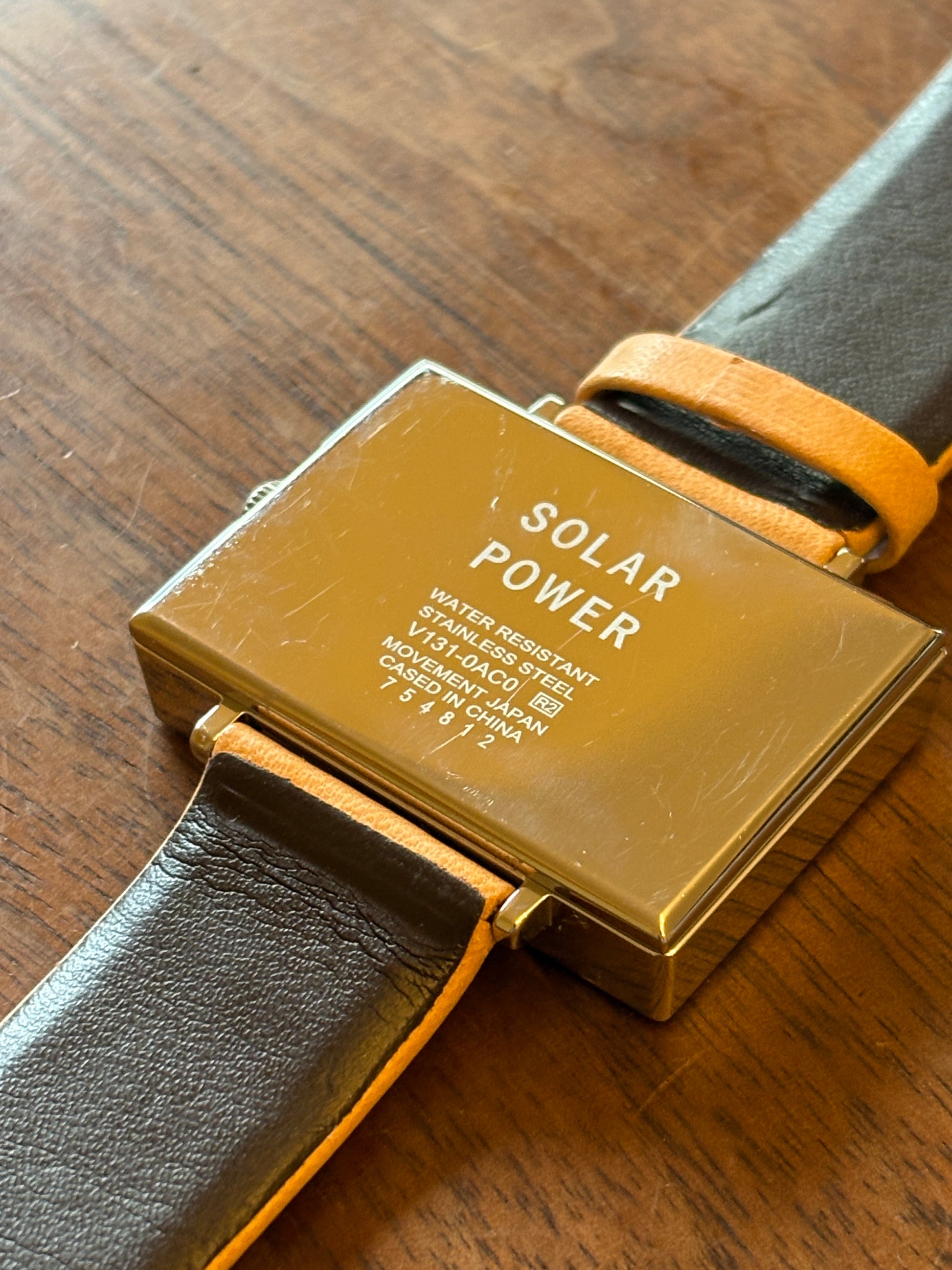 This is a very cute watch based on the MUJI station clock motif. It is solar-powered. It has a somewhat retro feel to it, and is very cool. The strap is made of tanned leather, which matches the watch. It is a watch that both men and women can enjoy. It has already been discontinued in Japan, and is very premium.