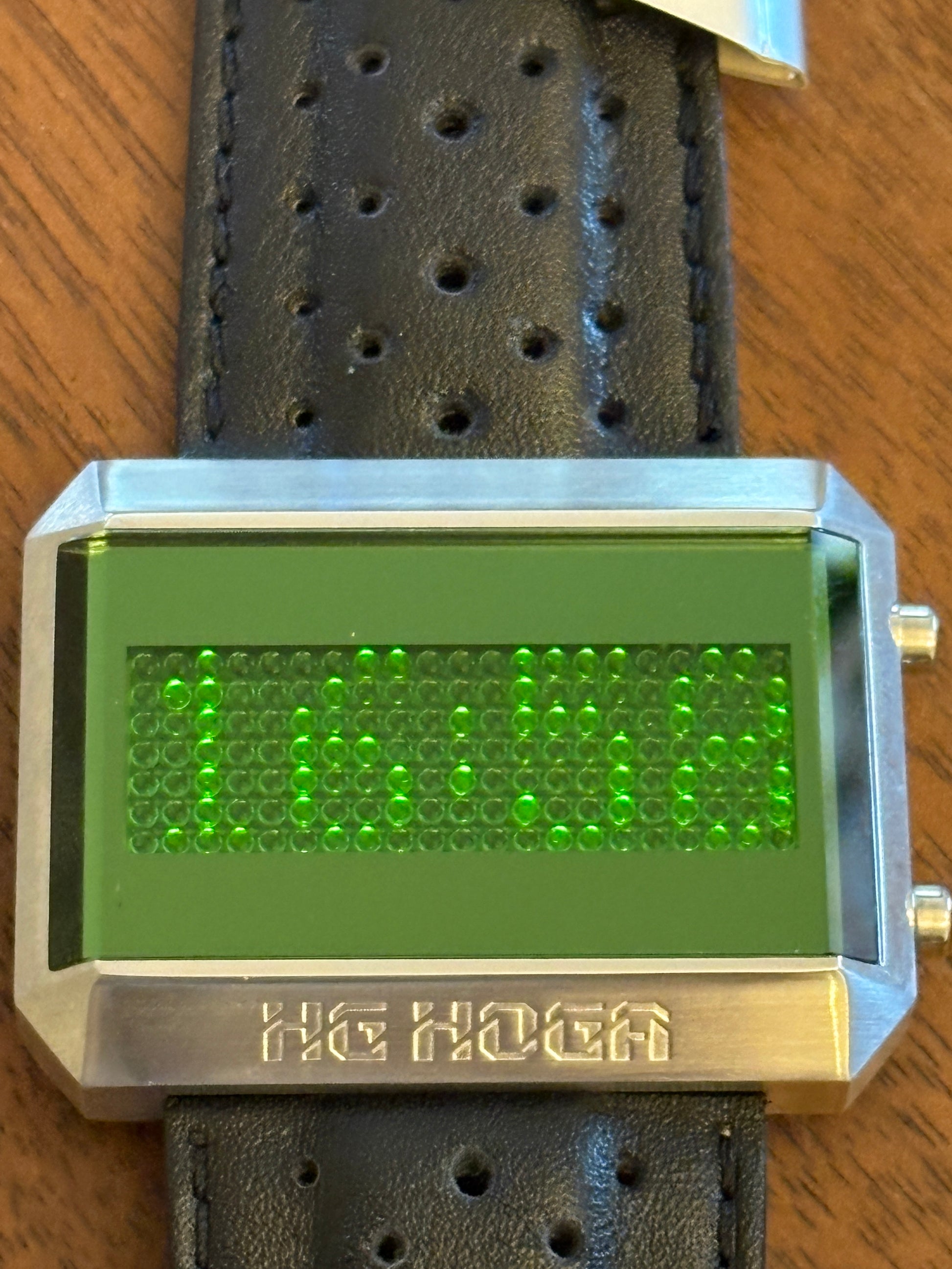 This is a very beautiful digital watch from HOGA. When you press the button, the time will scroll from the right side. The retro LED is very nice. This kind of nostalgic watch is very cool. It's very fresh. It is unused and in excellent condition.