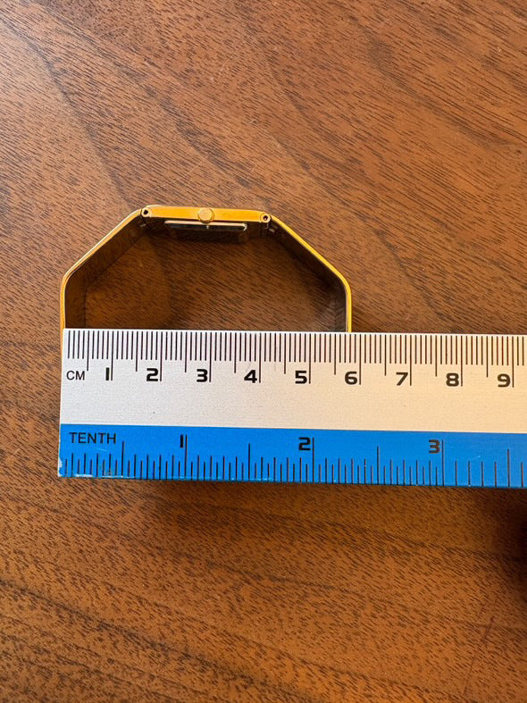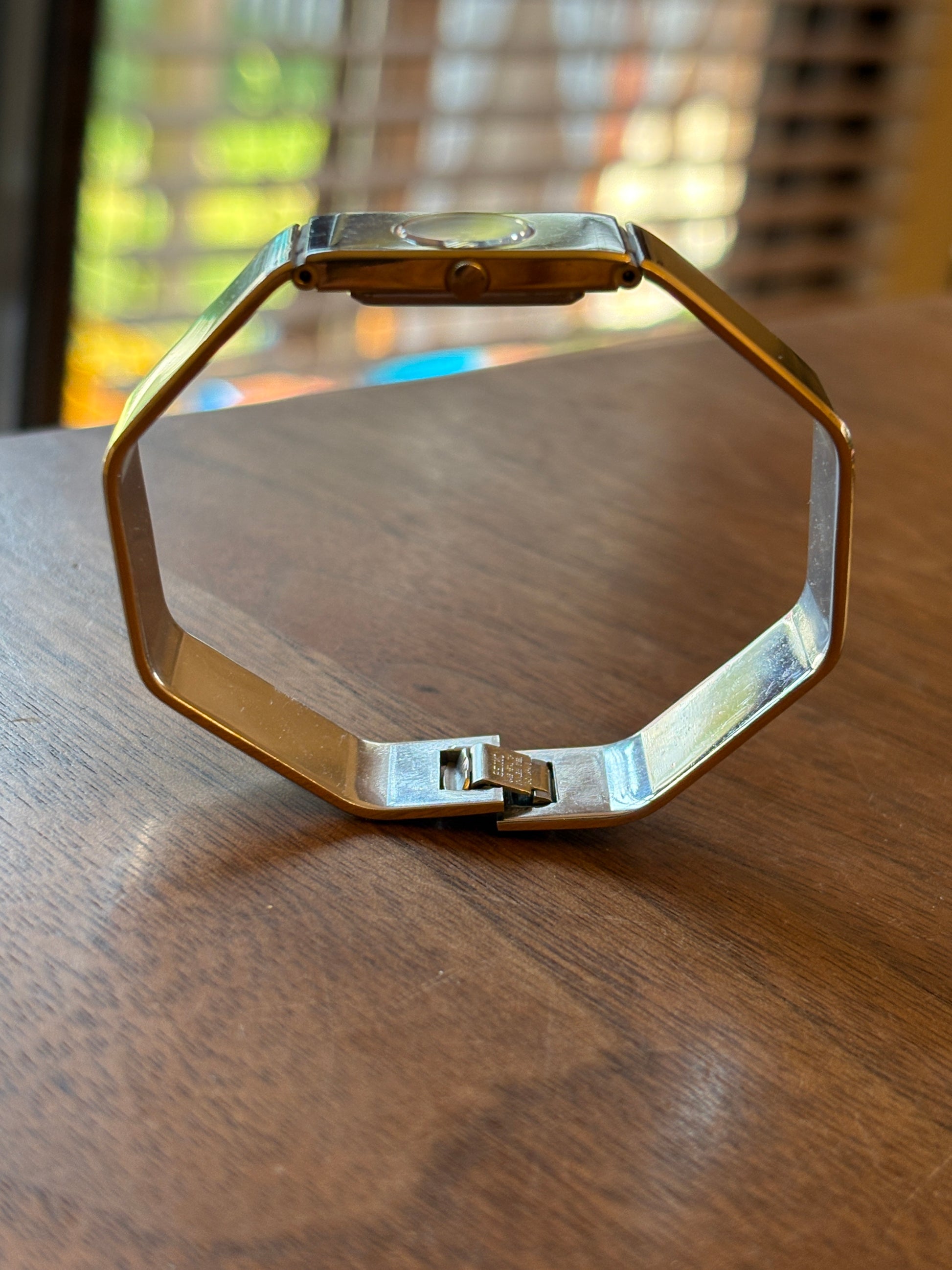 This is a beautiful Seiko octagonal bracelet watch. It looks perfect from any angle. It has a cool design that doesn't look vintage. It's beautiful from any angle. The size cannot be adjusted. I think it would look very cute if it was made larger like a bracelet. You could also stack several bracelets. It's hard to see, but there is about 1mm of gold in the body and the edge of the band. The condition is normal