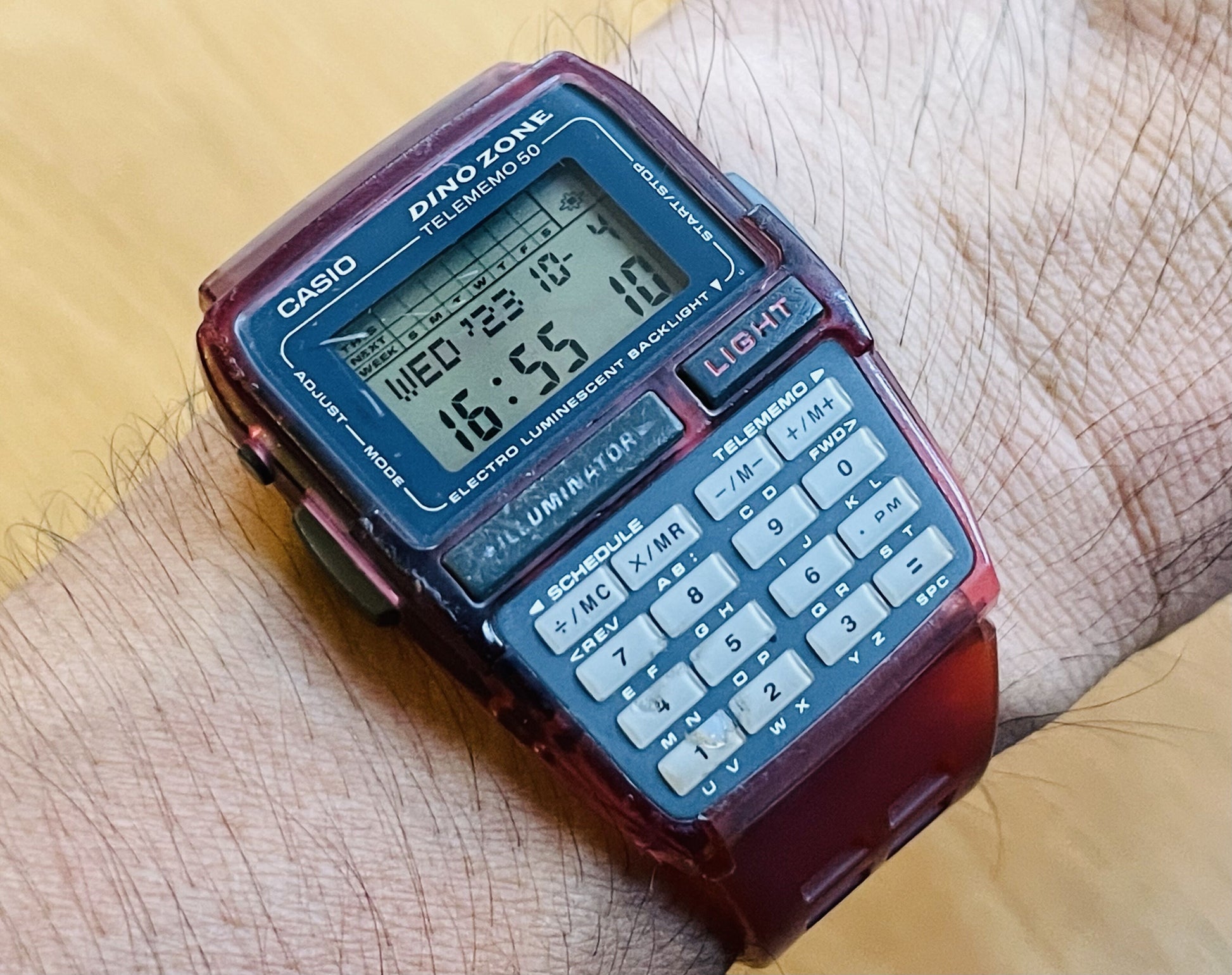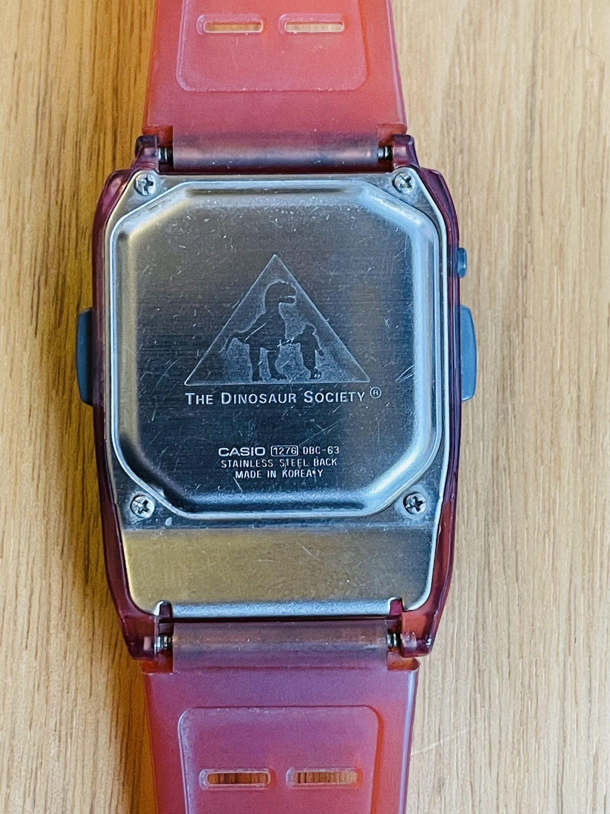 This is a red skeleton data bank. Very rare. Tyrannosaurus is displayed on LED. This is a watch that is rarely seen in Japan. For collectors, first come first served! It is working normally.