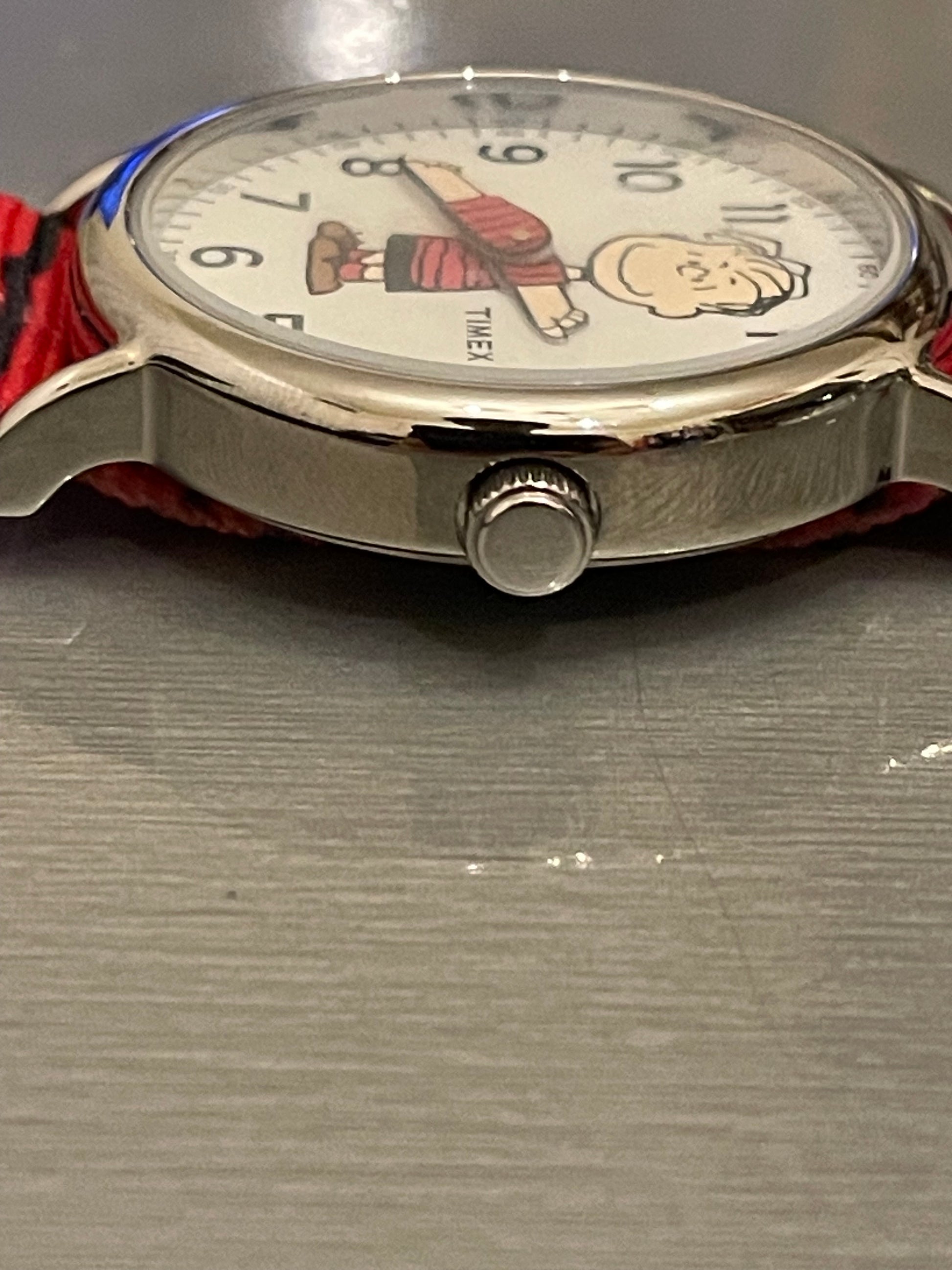 Charlie Brown happily rotates his arm to show the time on the slightly voluminous dial. This is an irresistible watch for peanut lovers. This is a rare Timex collaboration model. It is working normally. It's quartz.