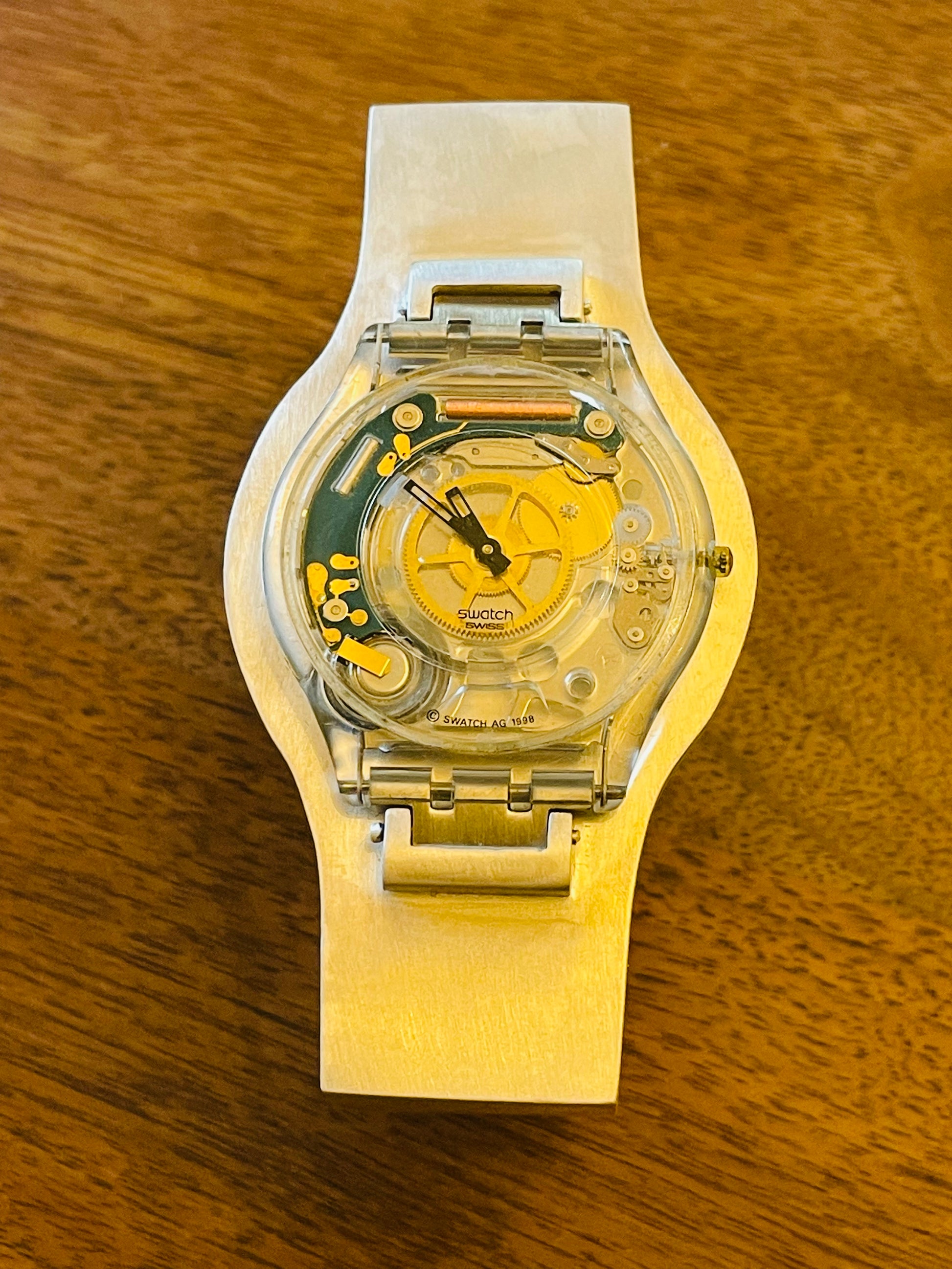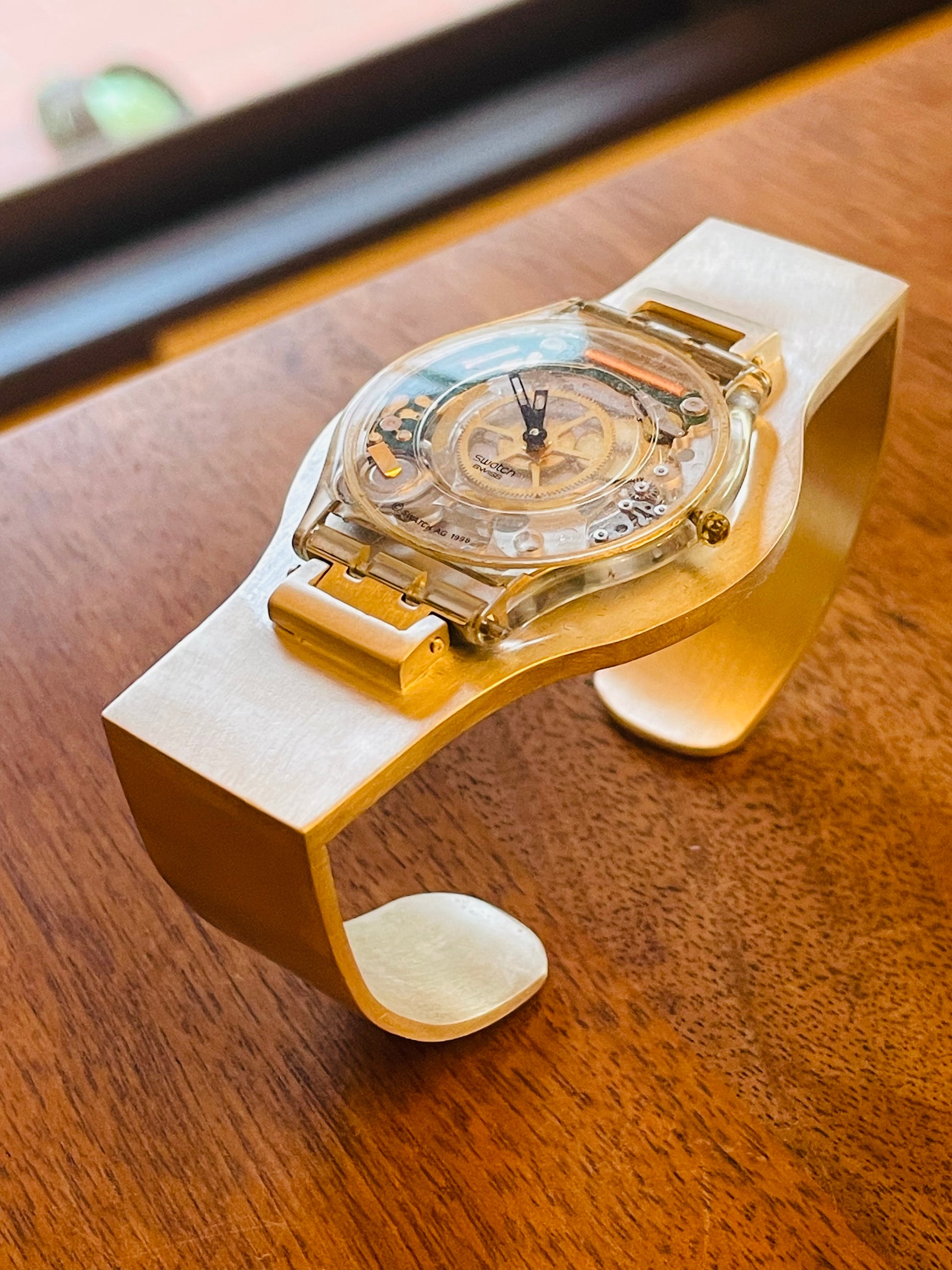 This is a special rare swatch that is only one in the world. We had a Japanese silver artist create a silver bangle that matches the skin skeleton model. This artist is a craftsman who also creates accessories for luxury brands that are well known around the world. He also made accessories for very famous people in Japan. The bangle was made to be thick and voluminous.
