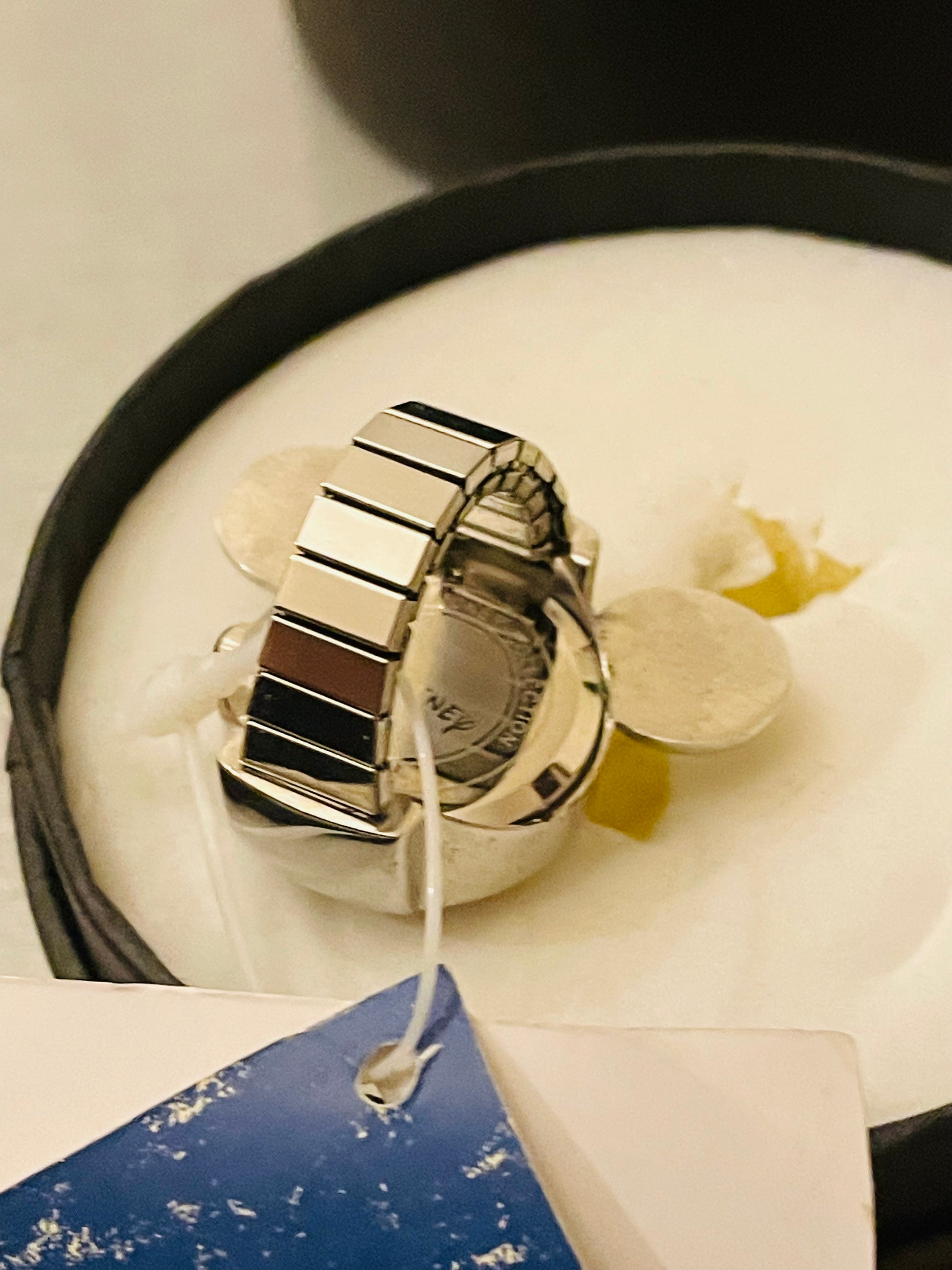 That's a really cute watch! A must-see for Mickey Mouse fans. Mickey's angry face is indescribably cute. It stretches and contracts, so it matches everyone. A box is also included. This is an unused item. It is working properly.