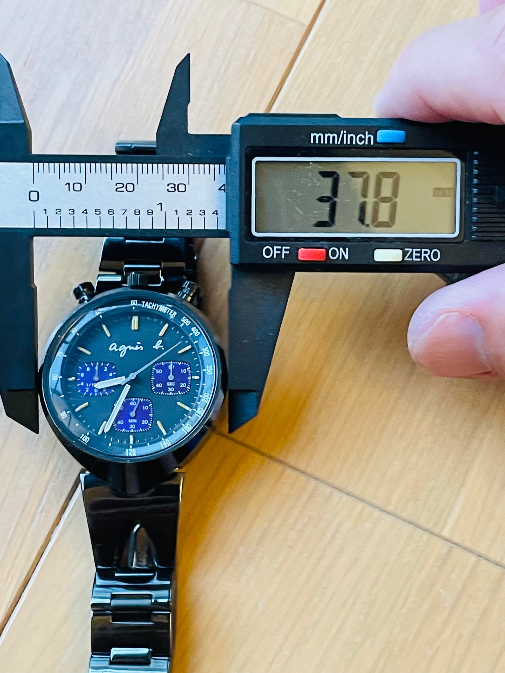 This is a collaboration model between Citizen and agnès b. The position of the buttons is very unique. This is a very popular model in Japan. It is working properly. The length of the belt is approximately 16 cm.