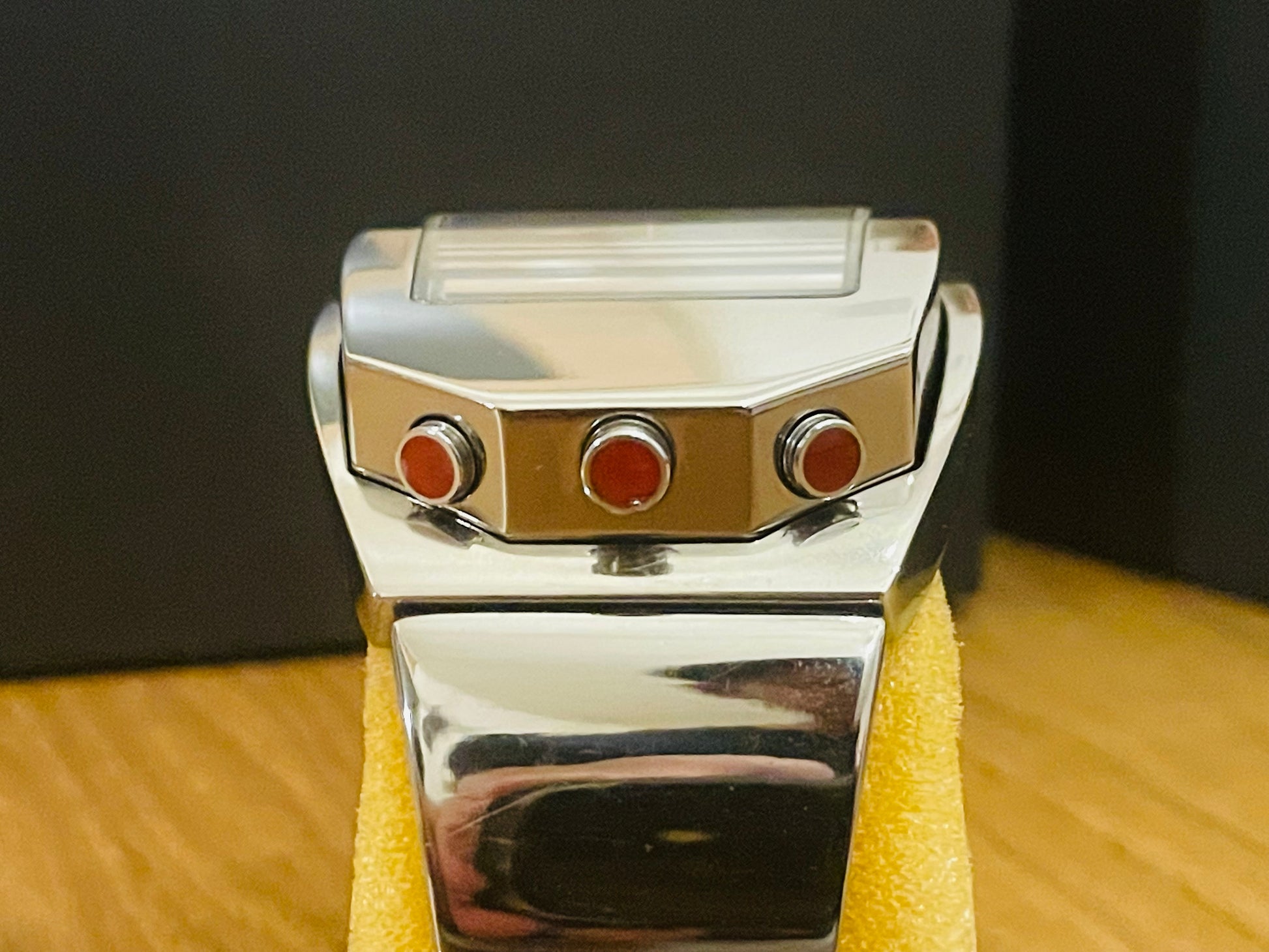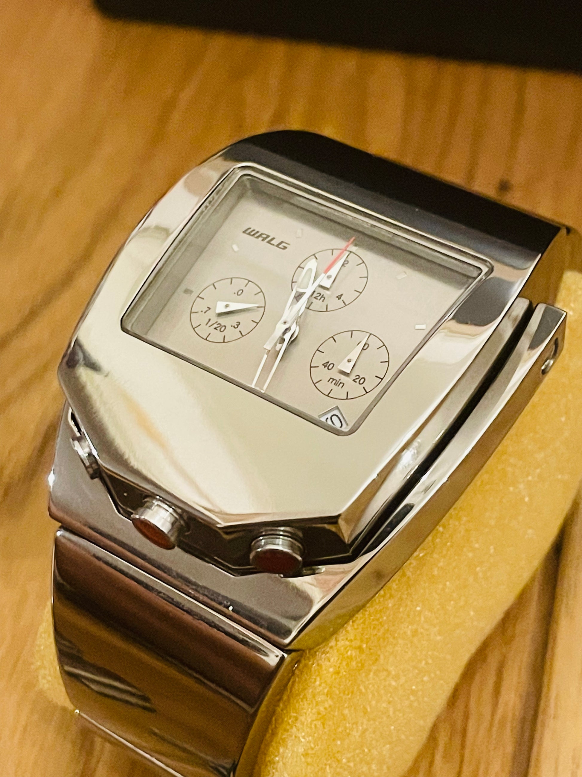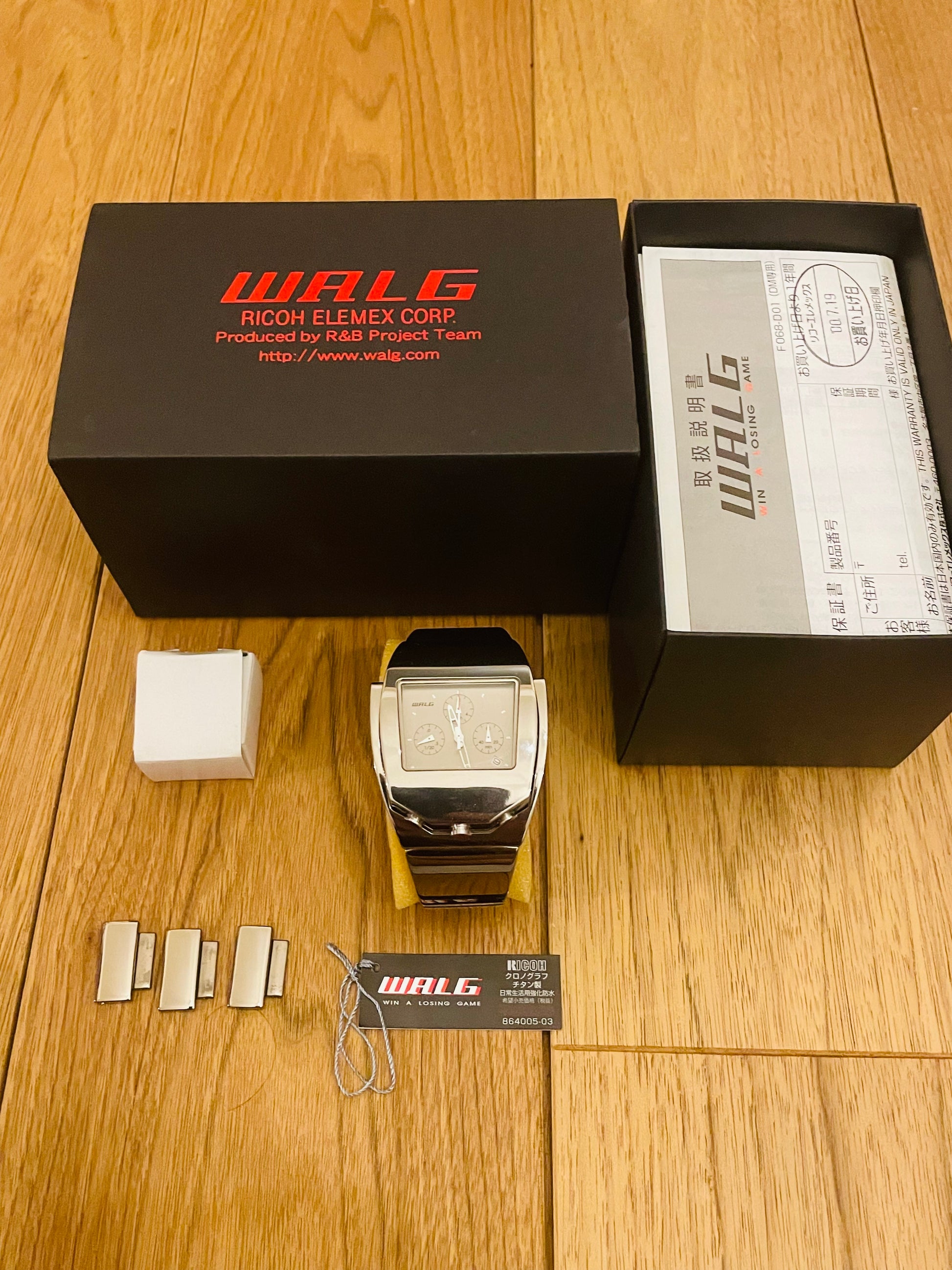 This is a very valuable wristwatch from RICOH. There are very few copies in circulation, and it is truly a miracle that it remains in this condition. It's quartz. The chronograph is also working properly. You can rarely find it even in Japan!The arm circumference is approximately 20cm.There is a red stone in the crown, which is very nice. The body is titanium. It has a very luxurious feel.