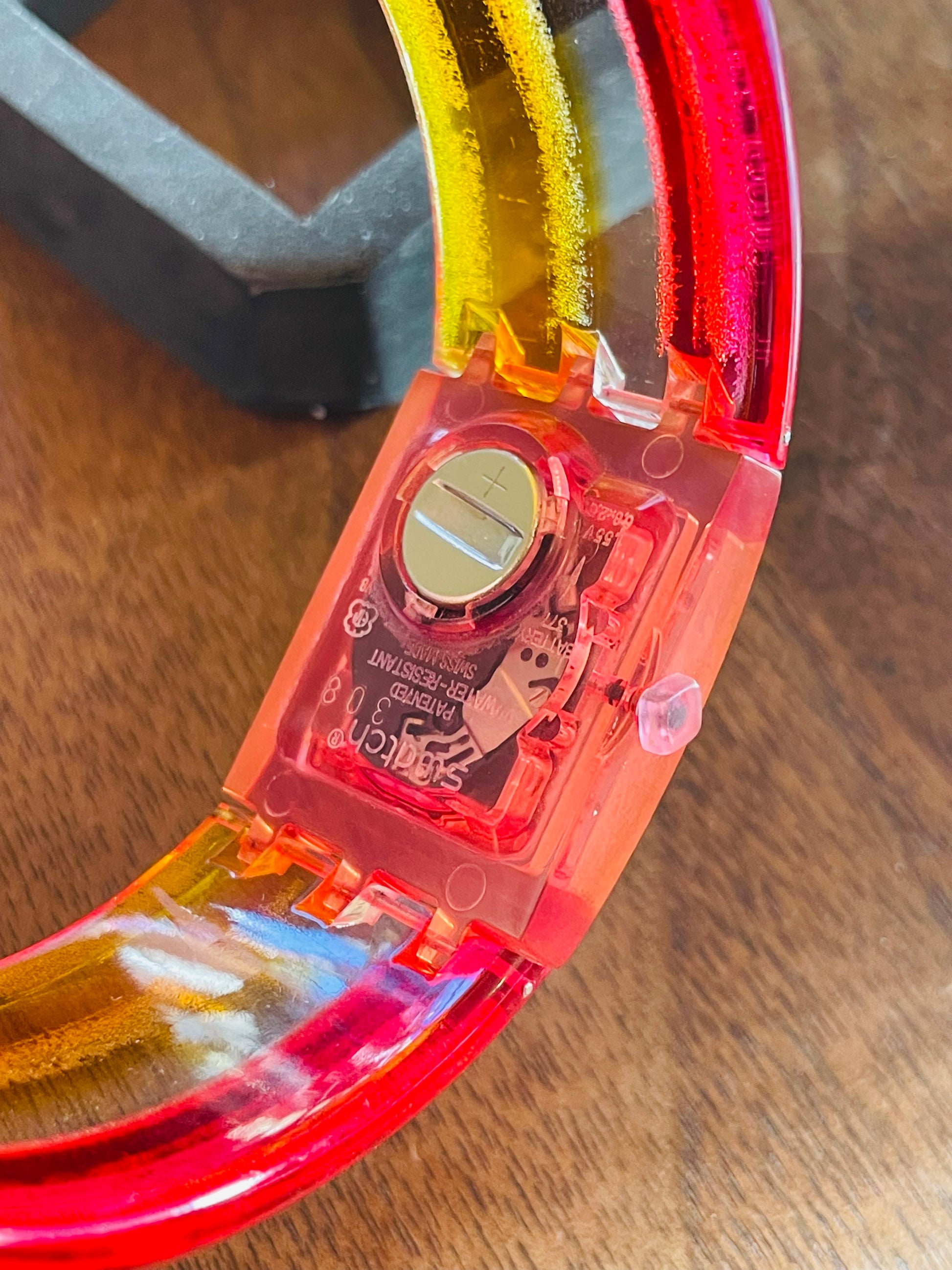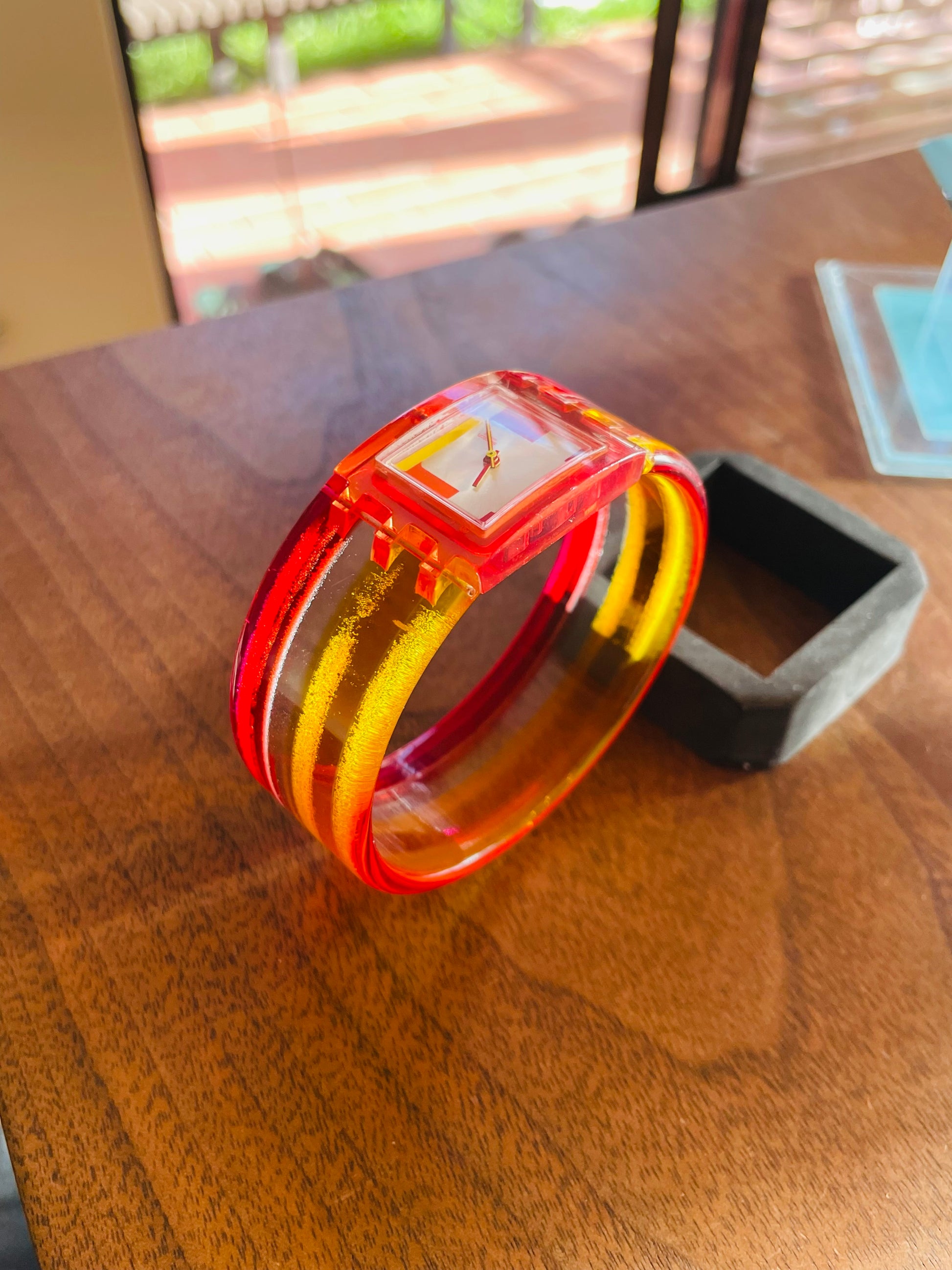 This is a very beautiful bracelet-shaped swatch. The coloring is really wonderful. All boxes and instructions are included. It is working properly.