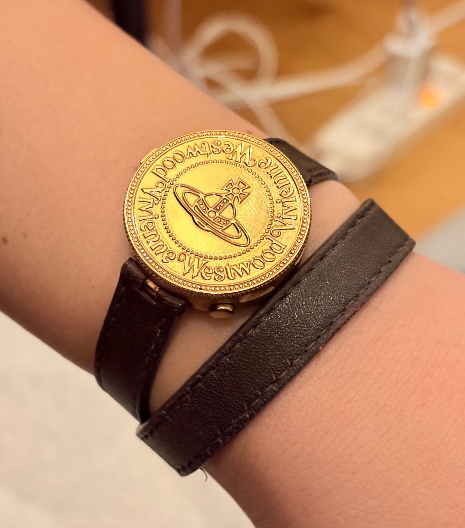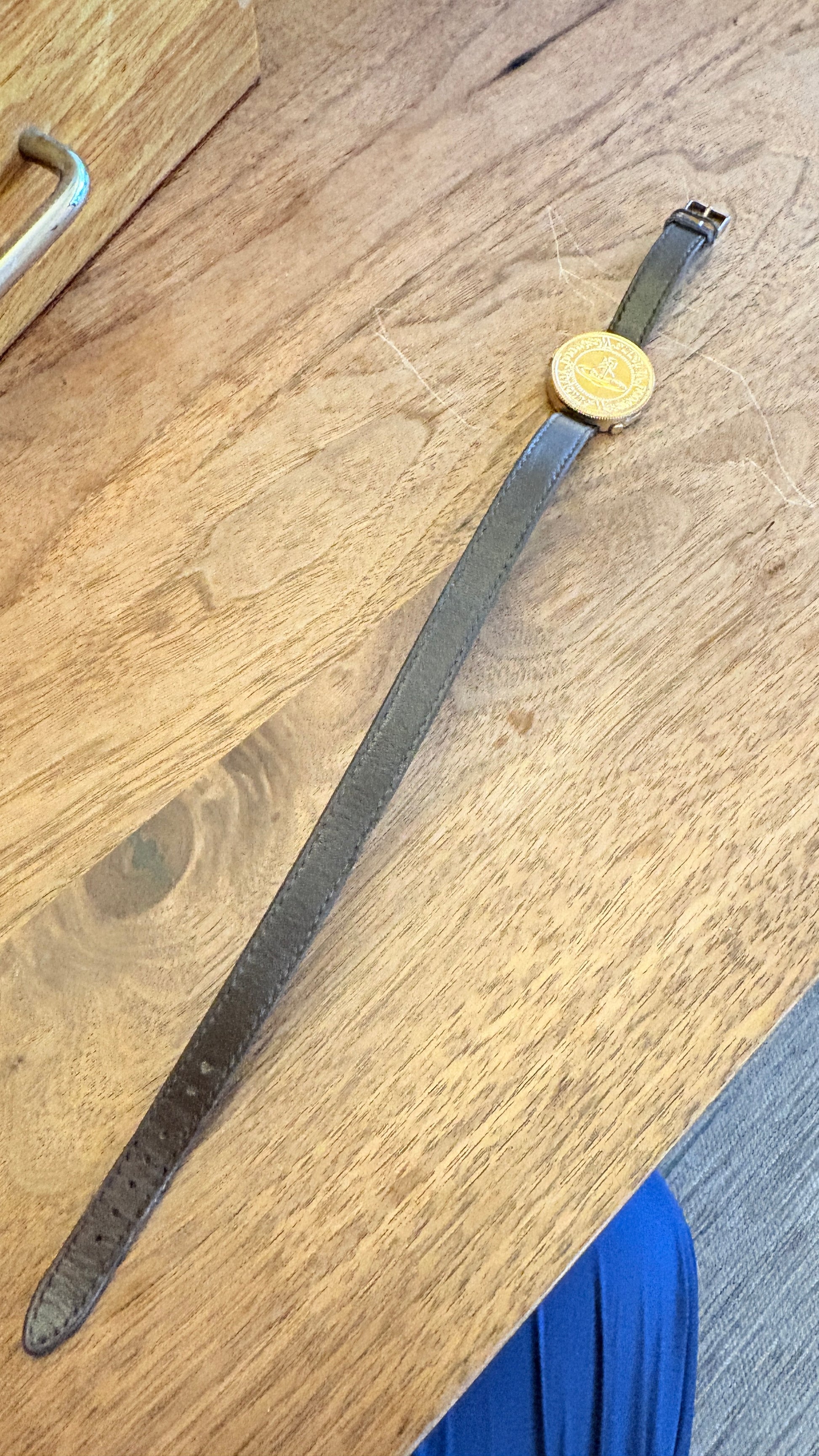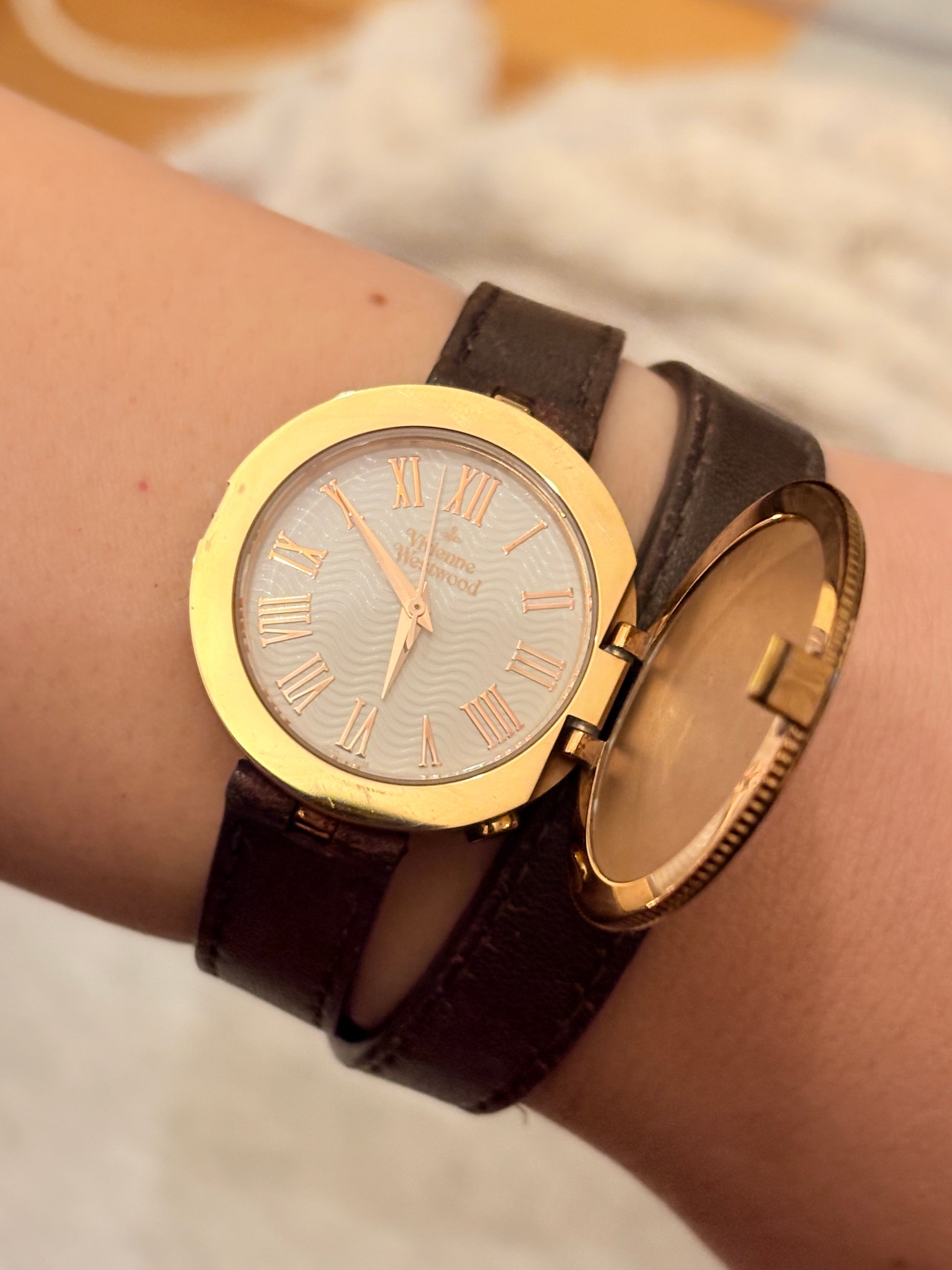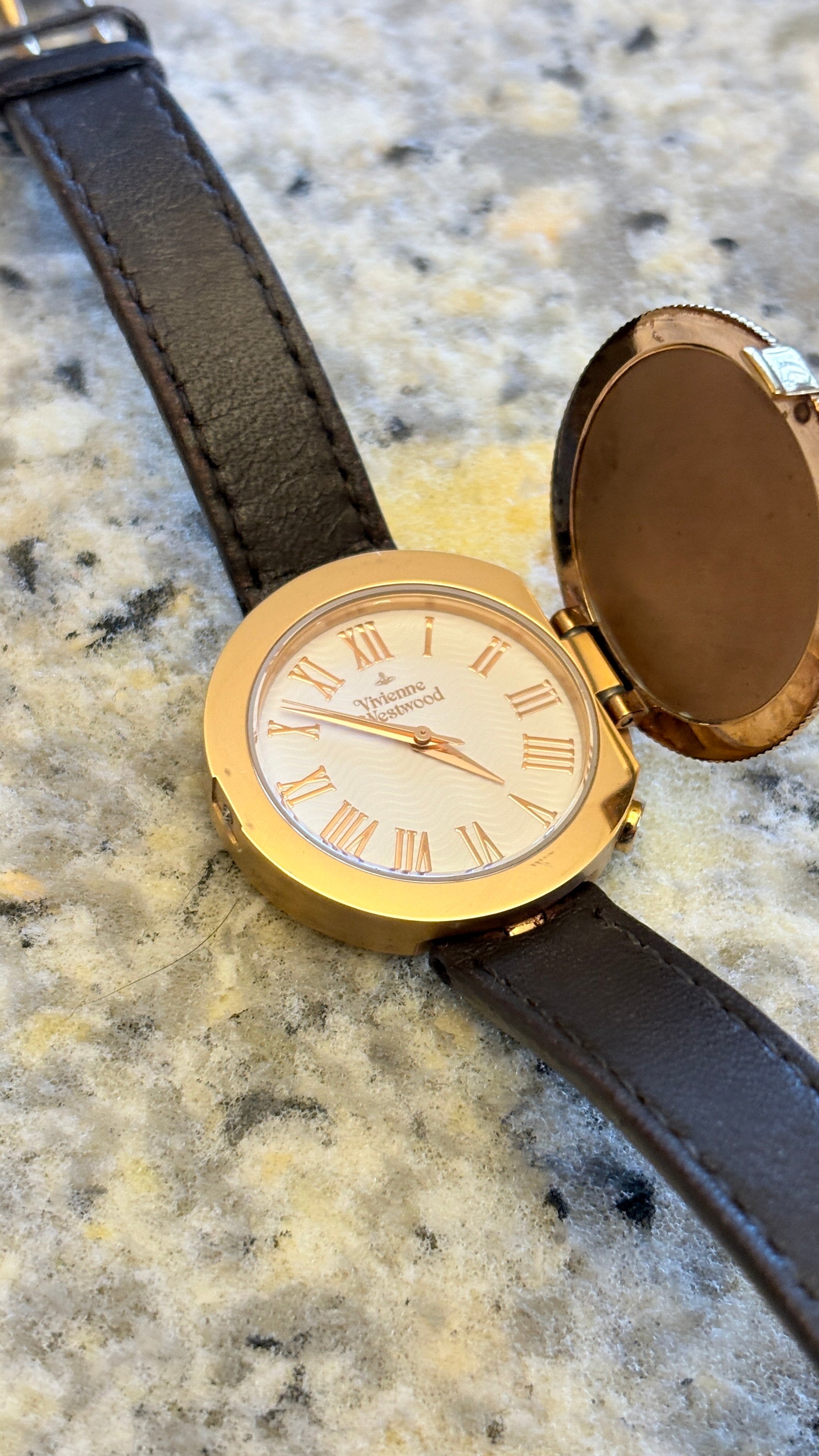 This is a very cute Vivienne Westwood watch. It's rare to find one with a lid. This is a watch that you can enjoy as if it were an accessory. The length of the belt is also really nice. It is working properly.
