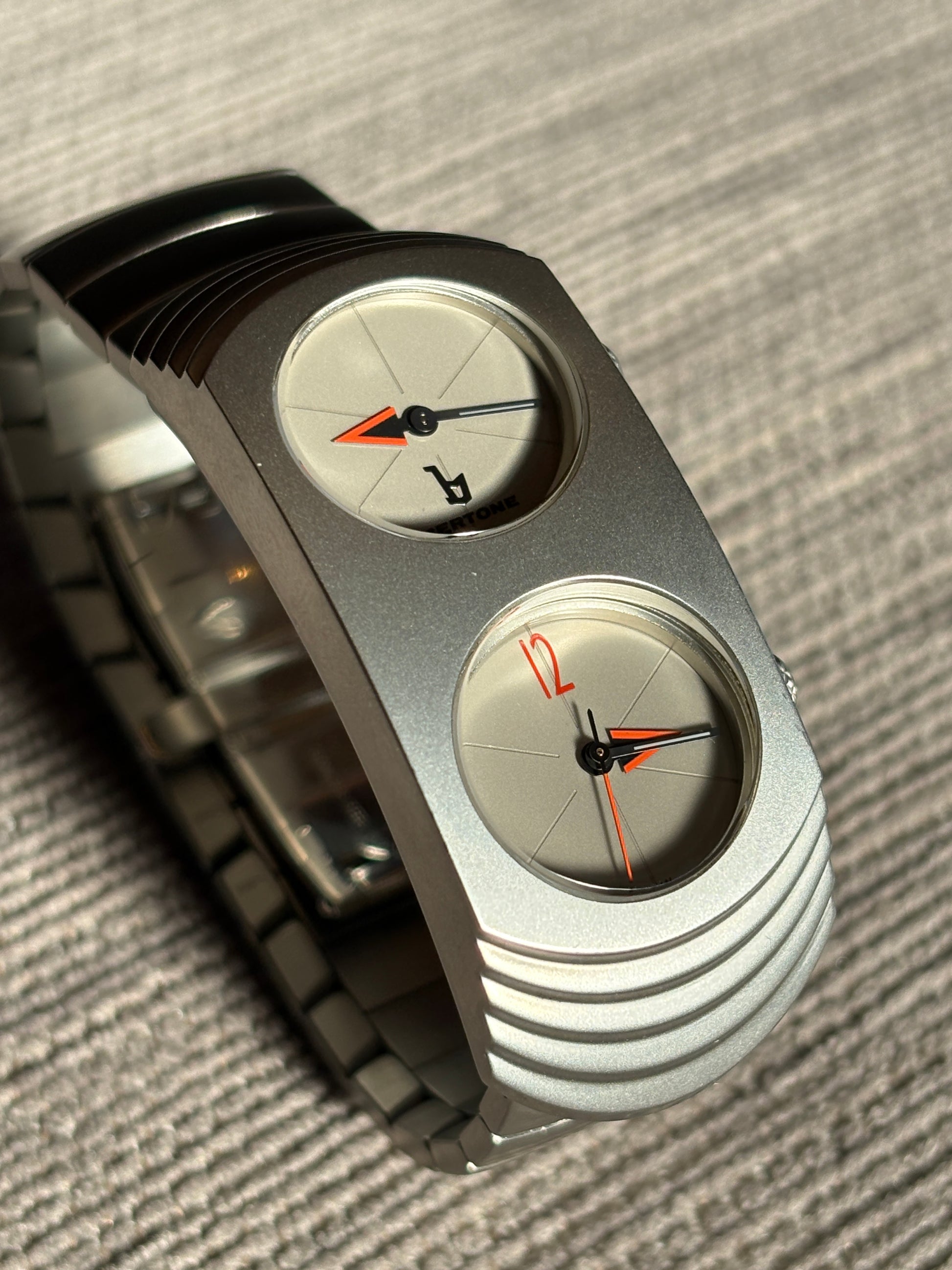 This watch embodies all of Bertone's beautiful designs. It's a truly beautiful watch from any angle, whether you look at it from above, from the side, or anywhere else. It's also in good condition, and all the strap links are included. It's a watch that suits both those with thin and thick wrists. It's a watch that can be used anywhere, whether for work or play. It's incredibly convenient. There are very few left, so it's first come, first served! It fits wrists up to about 22cm.