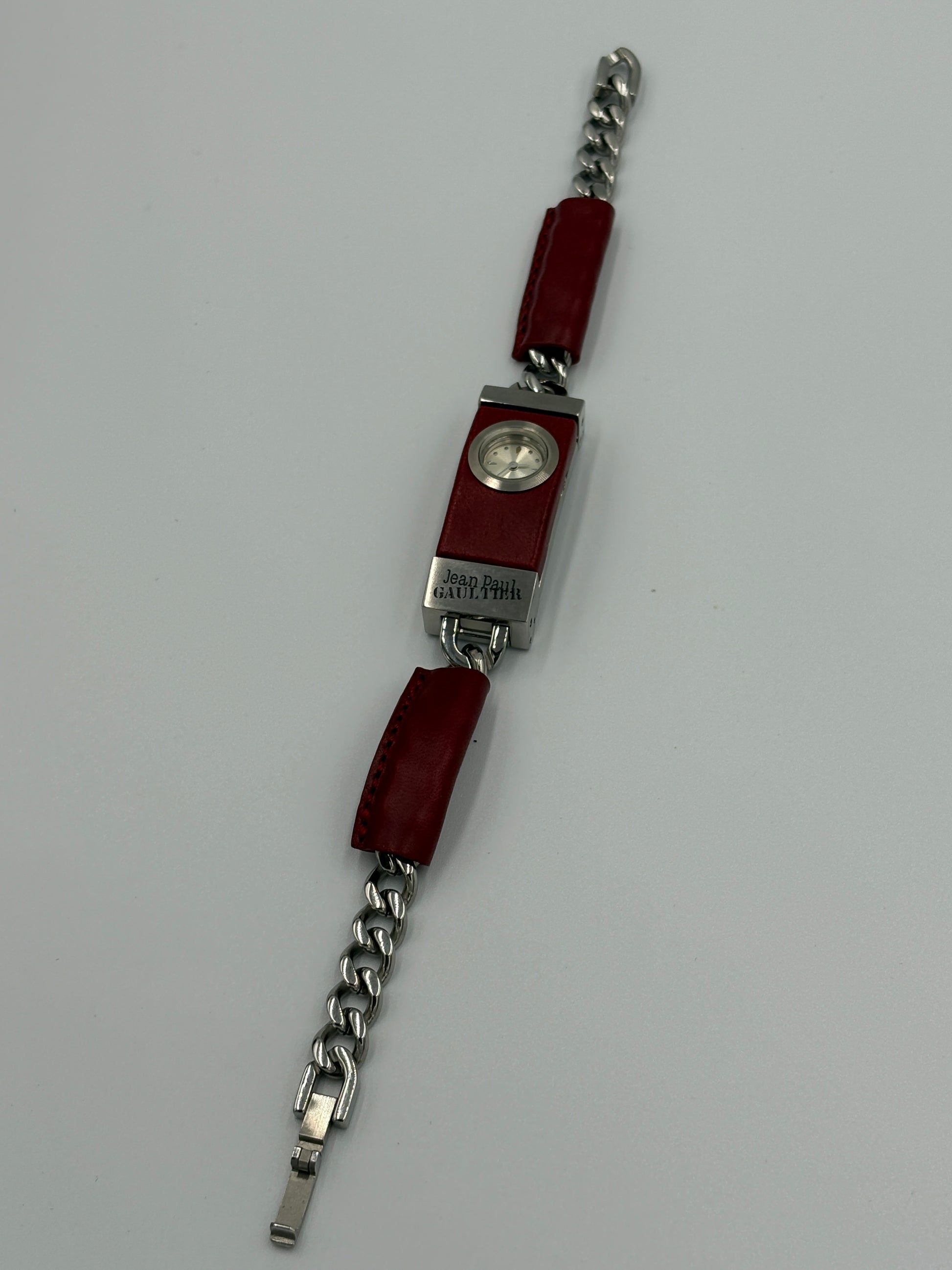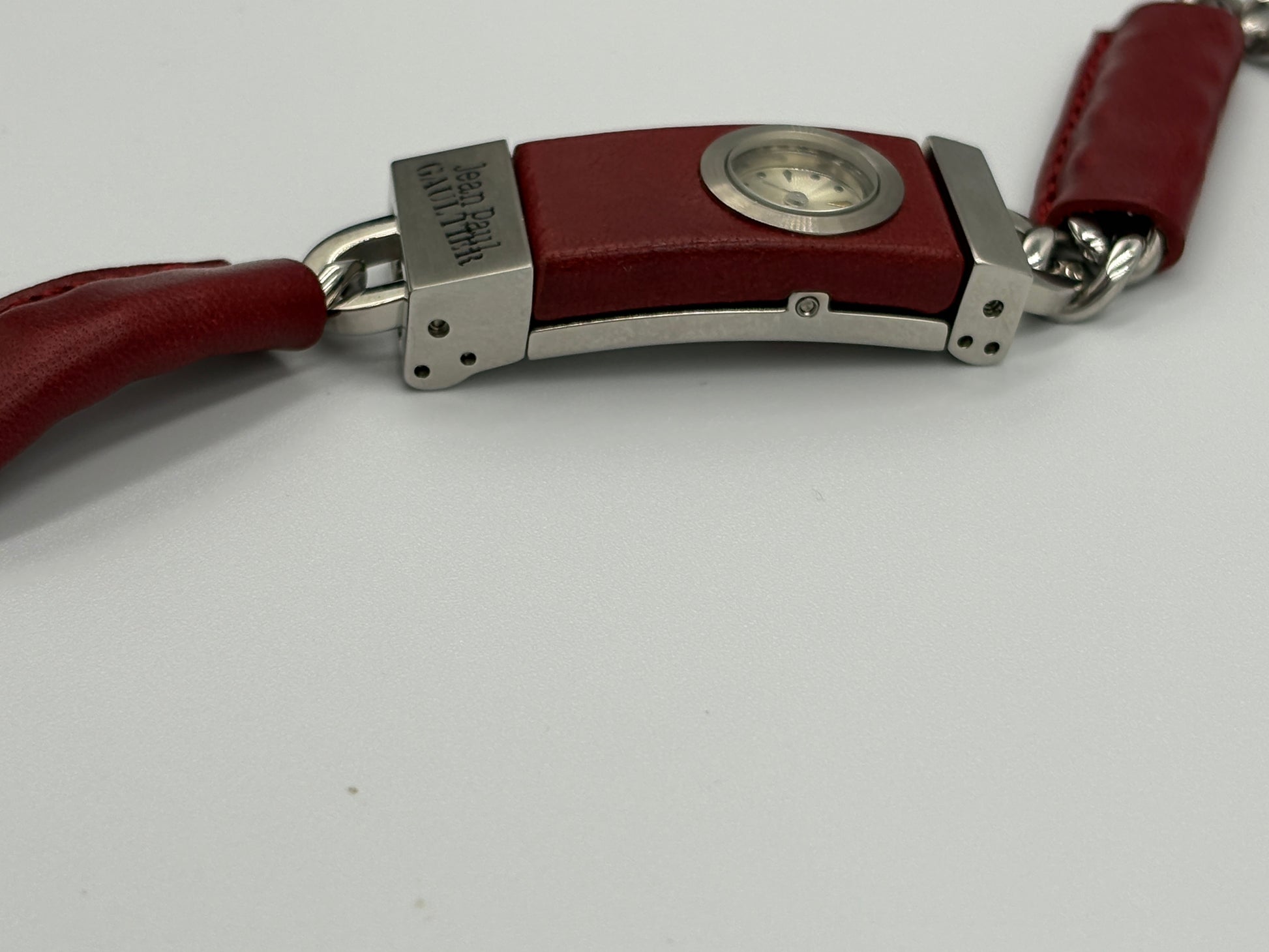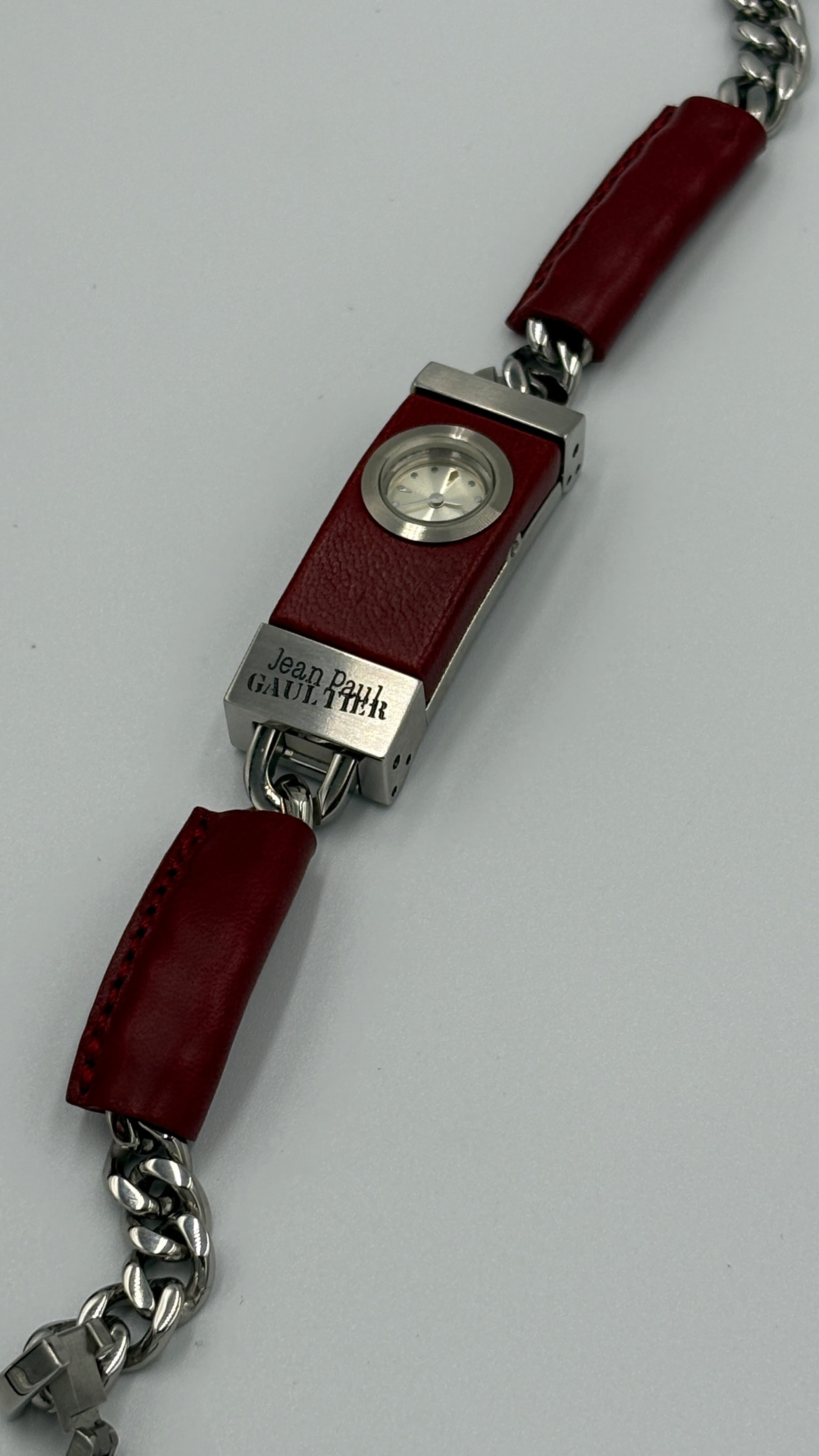 This is a very popular Gaultier bracelet watch. It's a special item, unused and complete with box and instructions. This watch, suitable for both men and women, looks truly timeless. It's a true Gaultier piece, and it's in perfect working order. This is a real bargain.