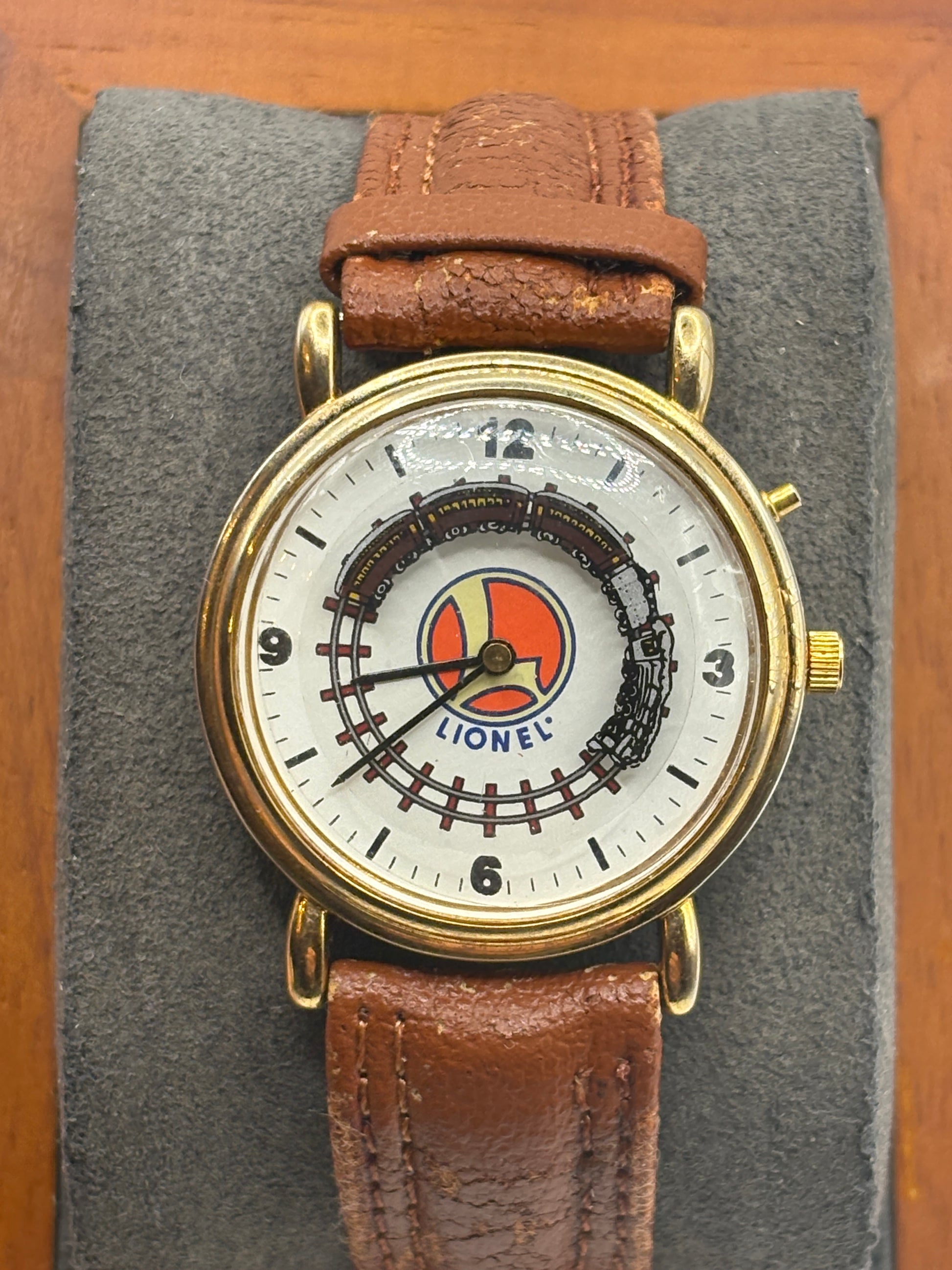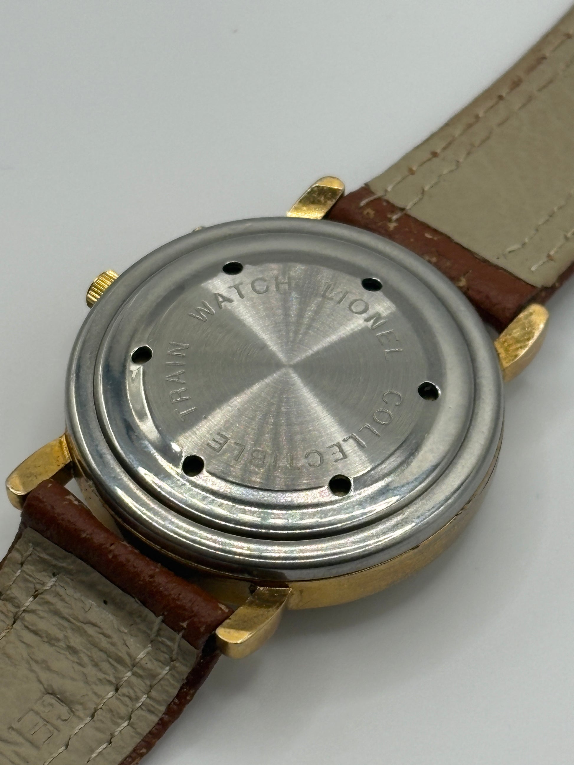 Instead of a second hand, a train glides joyously across the dial. It's a must-have watch for train lovers. Press the button and it plays various train sounds. They're pretty loud. It might be a little embarrassing to press the button in a quiet place, lol. It's very rare to see a watch that even makes sounds. It's in perfect working order.