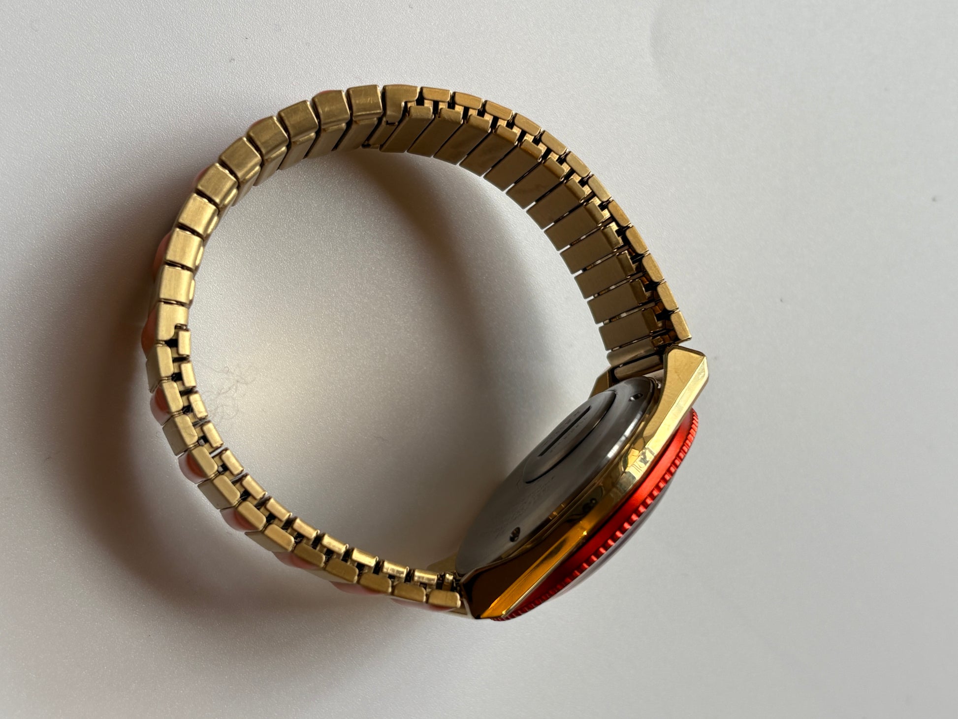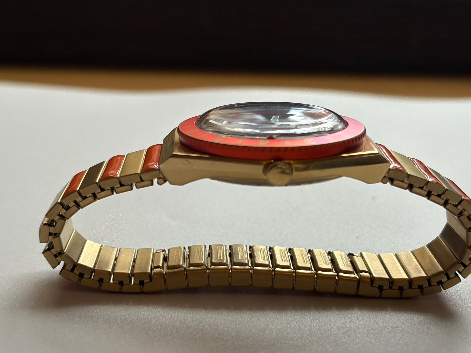 Introducing the "Q TIMEX" in "MALIBU" color, inspired by Malibu Beach in California, a stunning location surrounded by mountains and rivers. The expandable metal expansion strap fits perfectly, and a new mechanism has been adopted that allows links to be fired without tools. The pink and orange reminiscent of a beach sunset stand out against the black dial. It is in very good condition and works properly. It was in my collection, but I have decided to let it go.