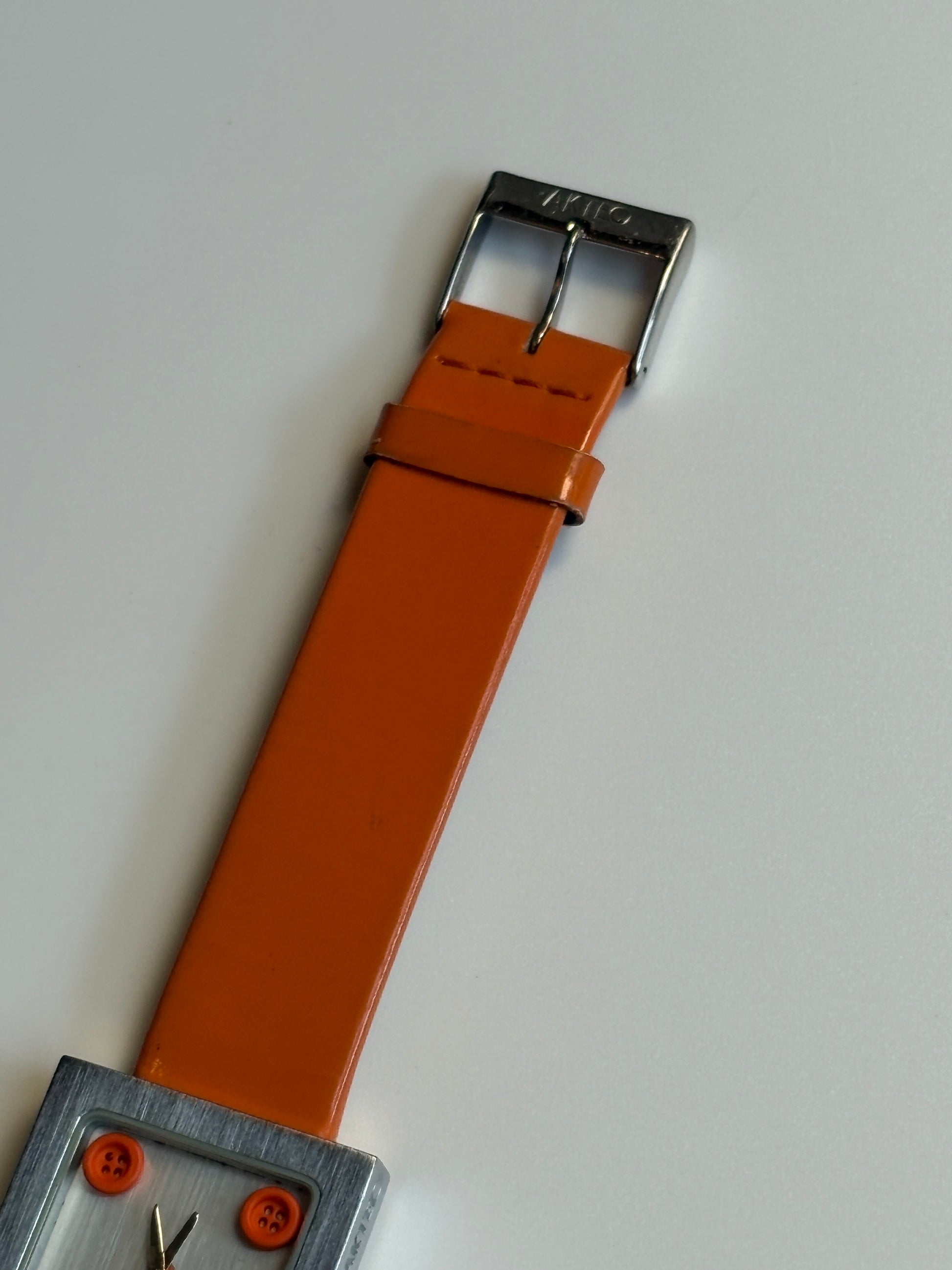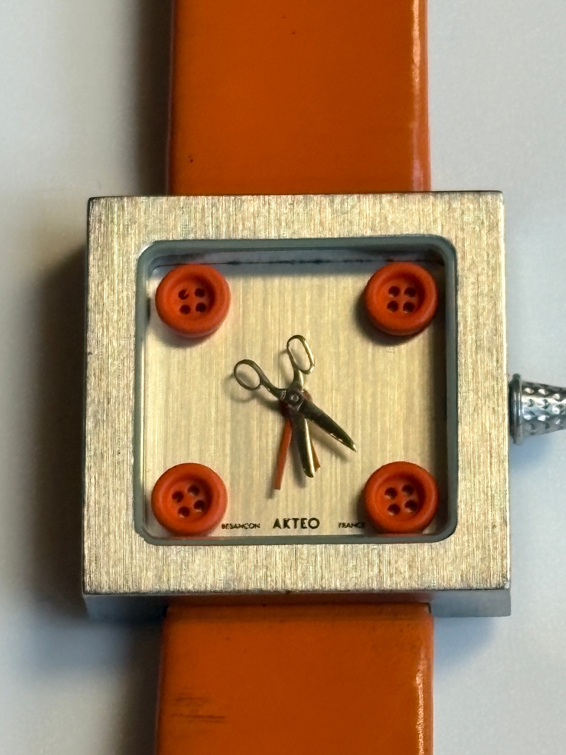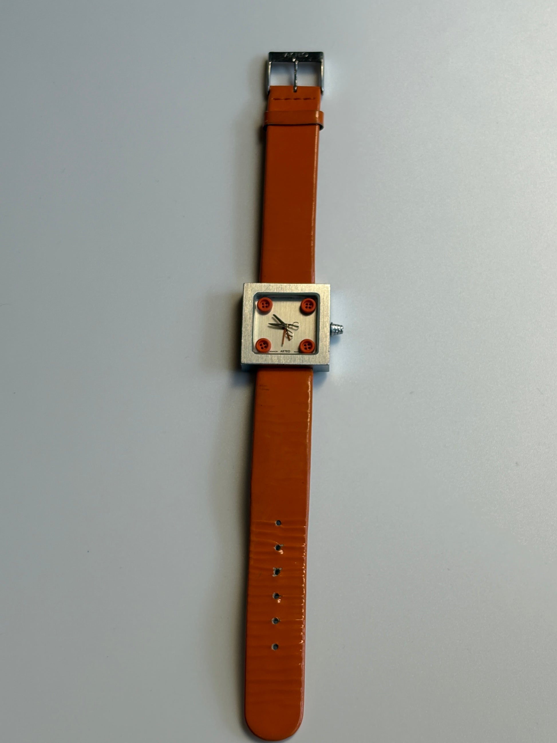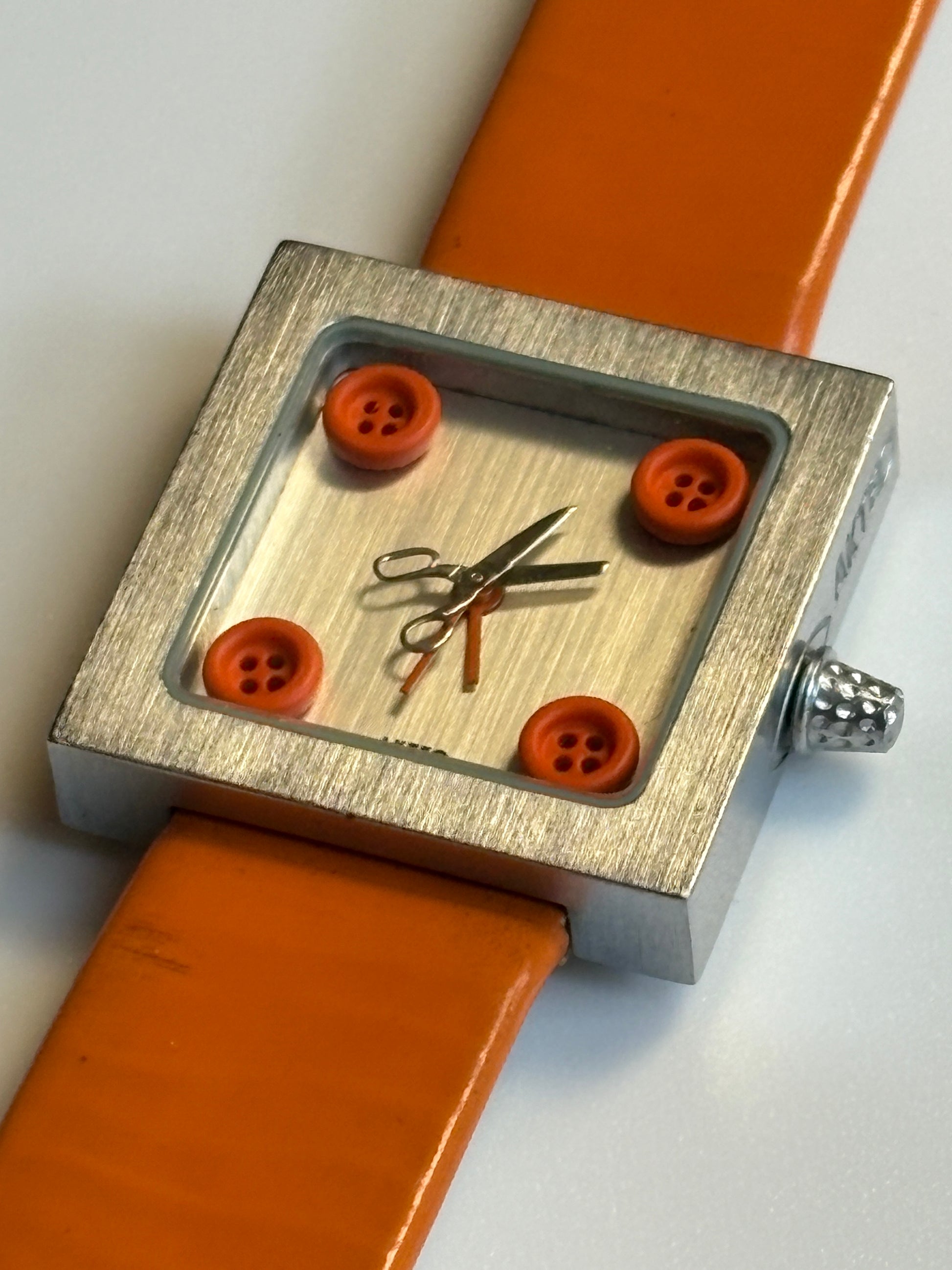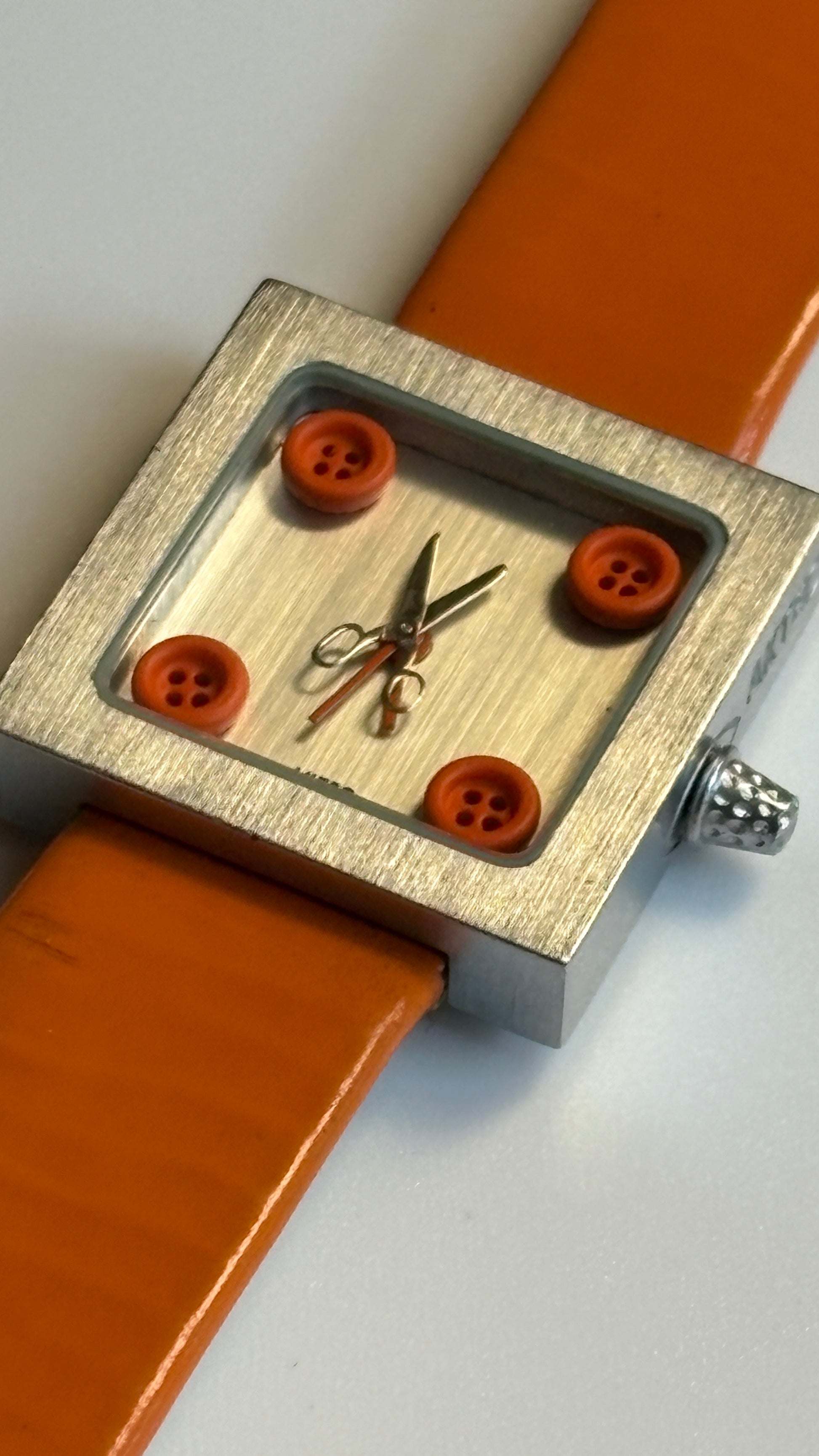 This is a very cute watch from Acteo. It has four square buttons, a scissors-shaped second hand, and a thimble-shaped crown. It's perfect for people who love sewing. The orange enamel strap is very cute. There is some damage on the back.