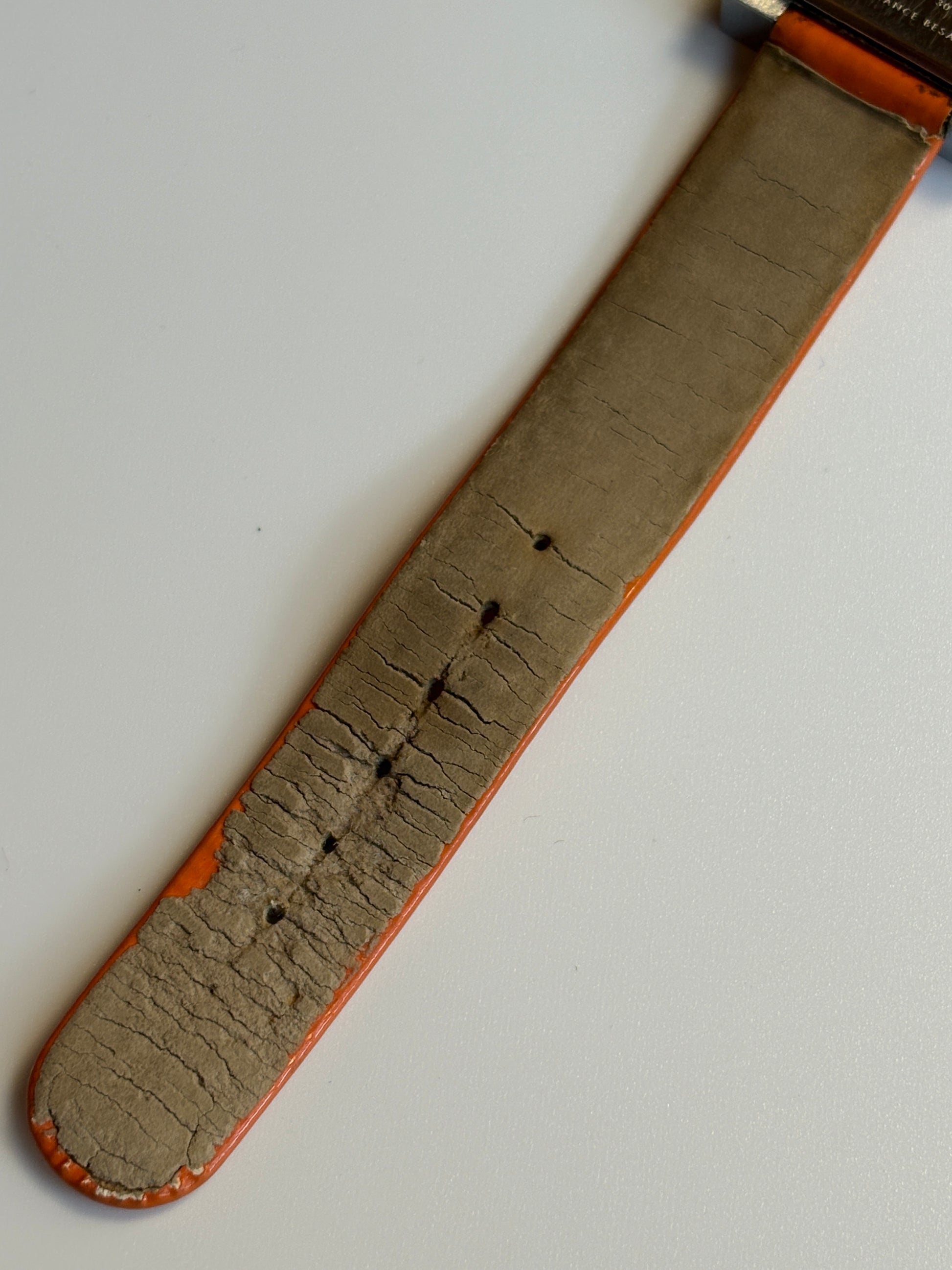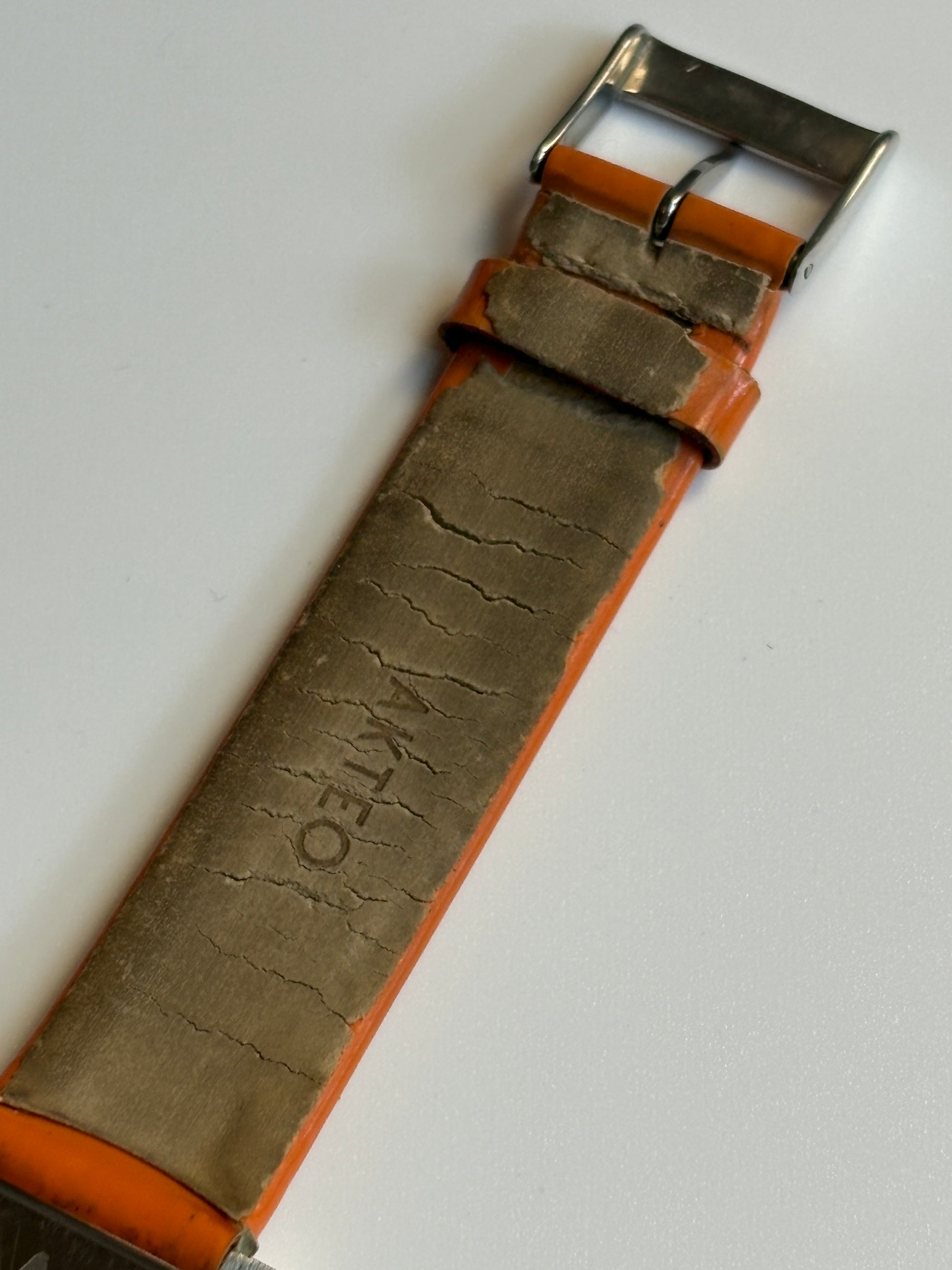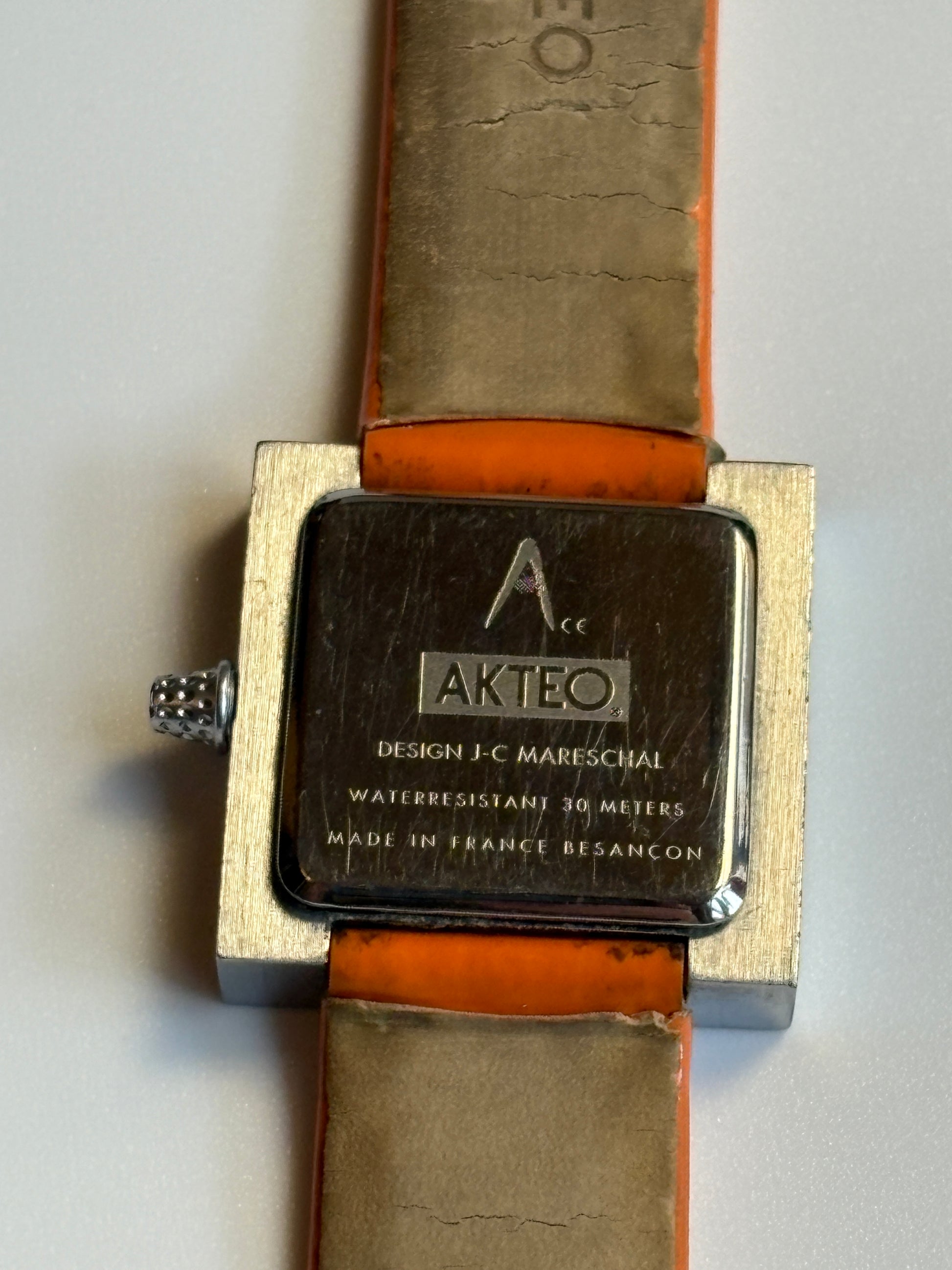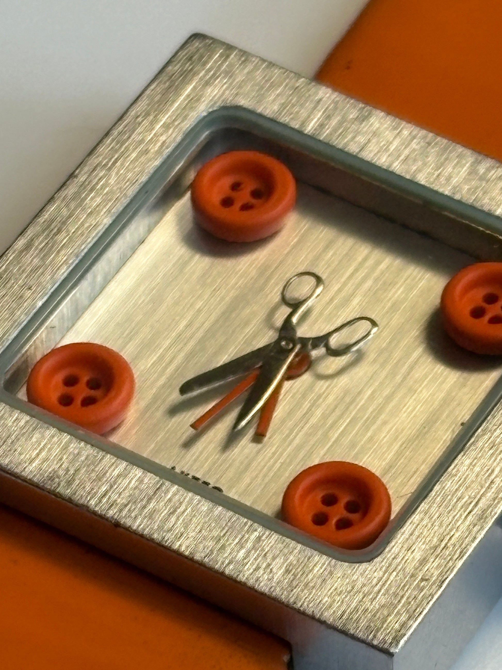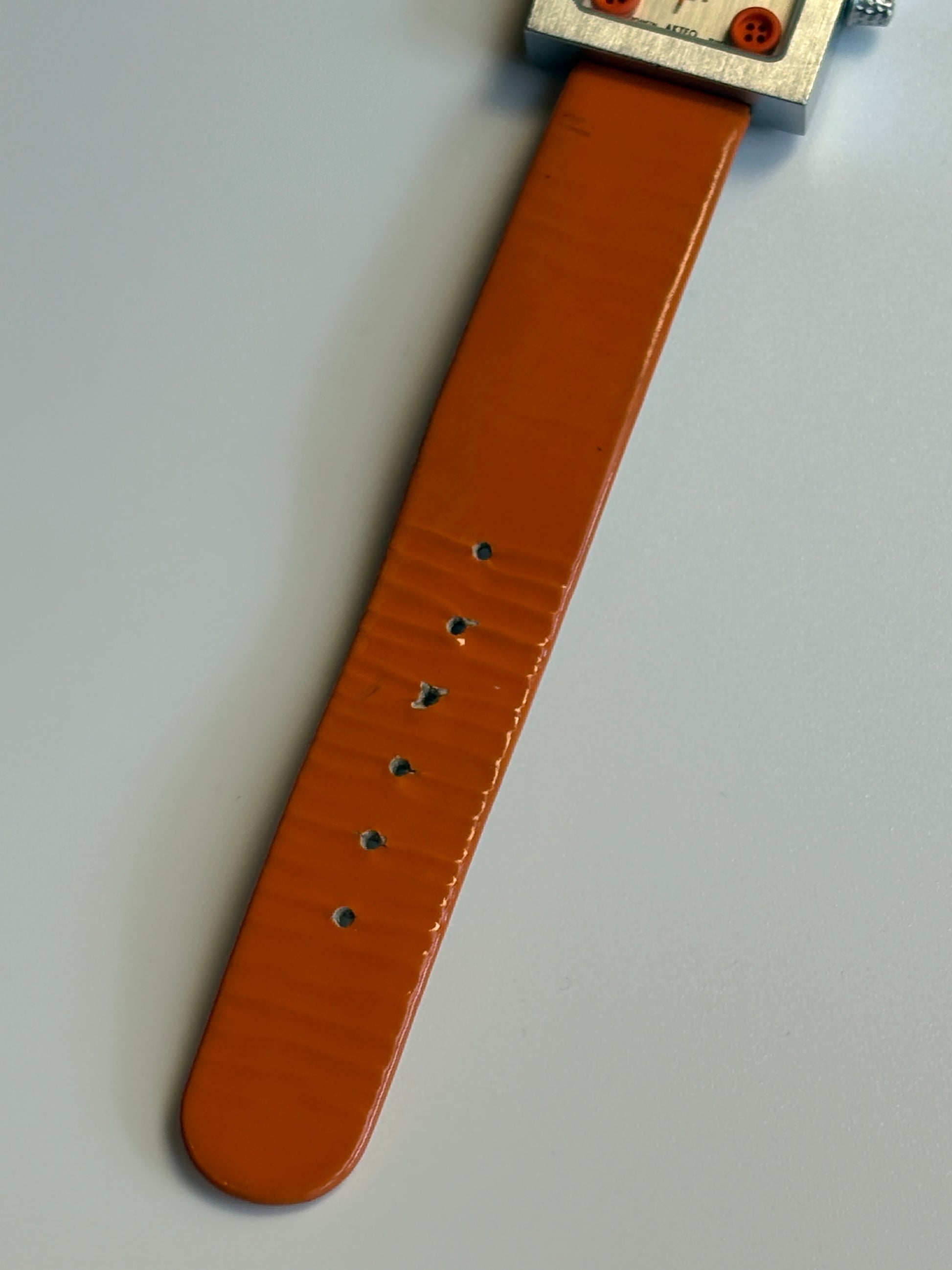 This is a very cute watch from Acteo. It has four square buttons, a scissors-shaped second hand, and a thimble-shaped crown. It's perfect for people who love sewing. The orange enamel strap is very cute. There is some damage on the back.