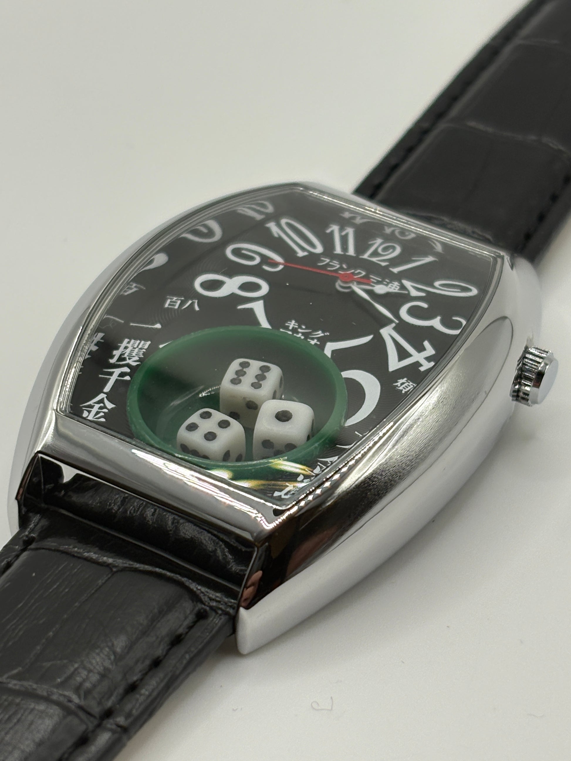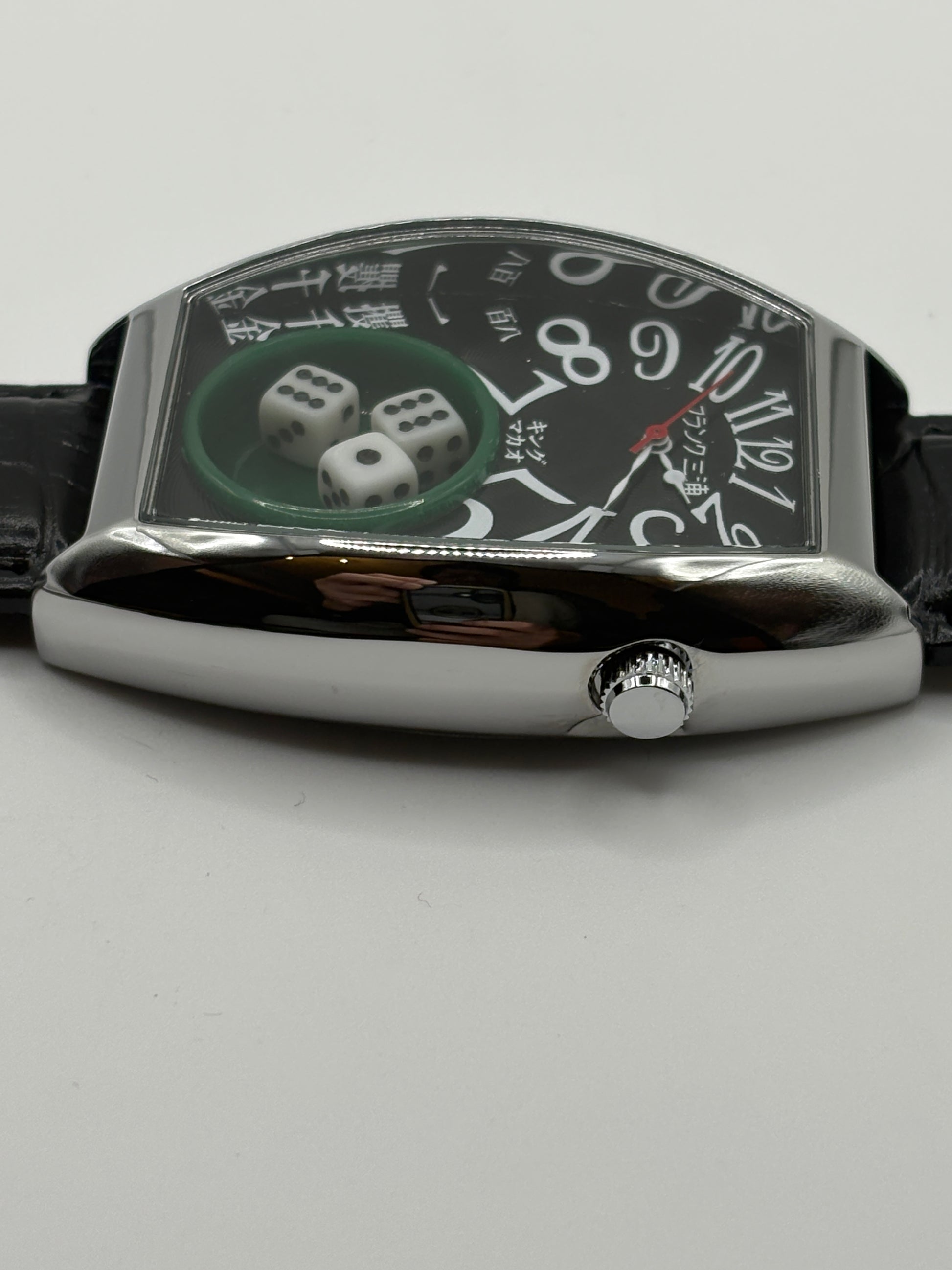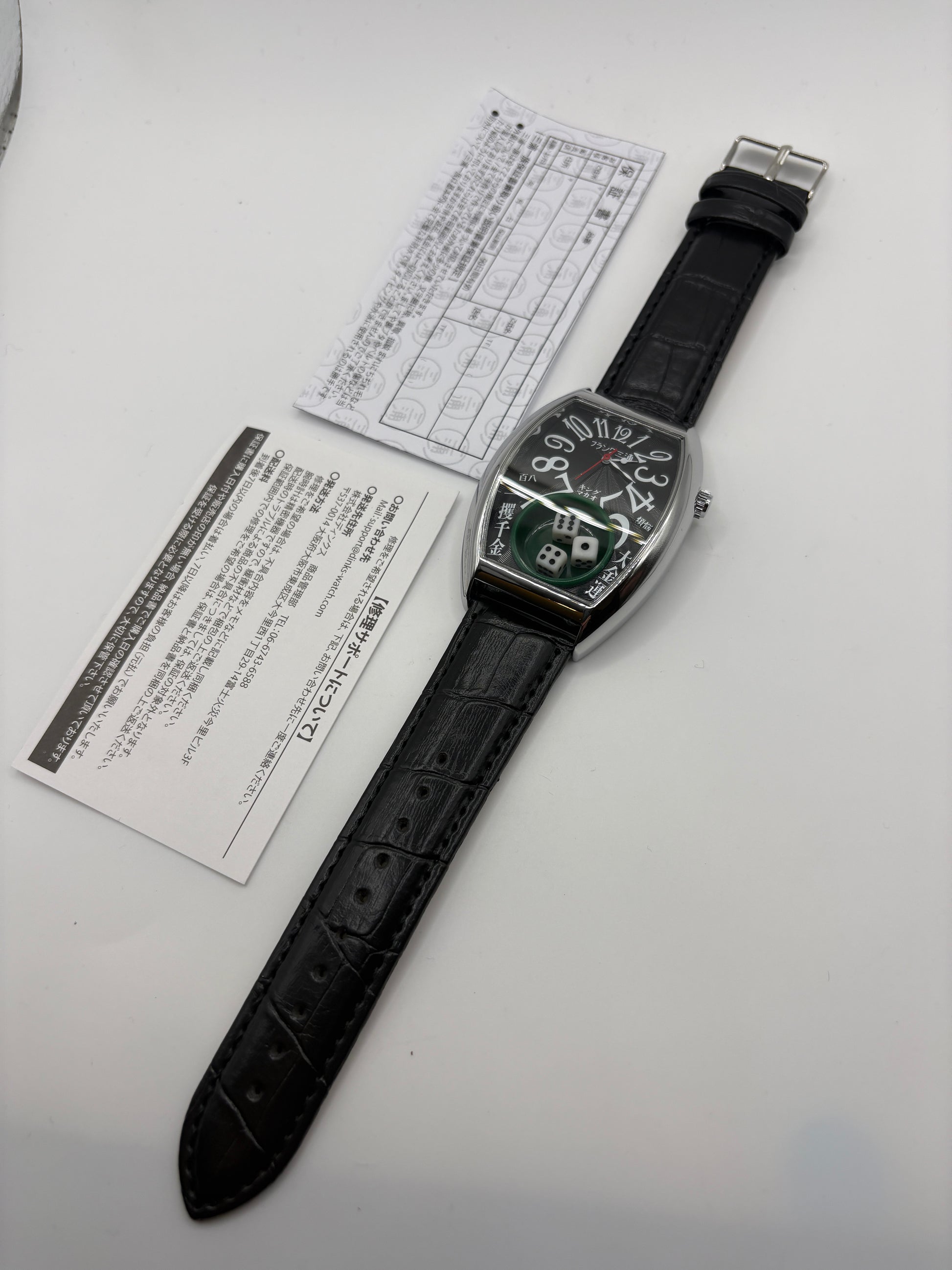 This is Frank Miura's Macau No. 5 modified. It's a must-have watch for gambling enthusiasts. I'd never go gambling without this watch, lol. It's a really eye-catching watch. It's perfect for a story. It's in perfect working order. Approximate dimensions: Case: 47 x 42 x 14 mm. Strap: Maximum wrist circumference: 22 cm.